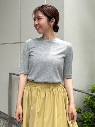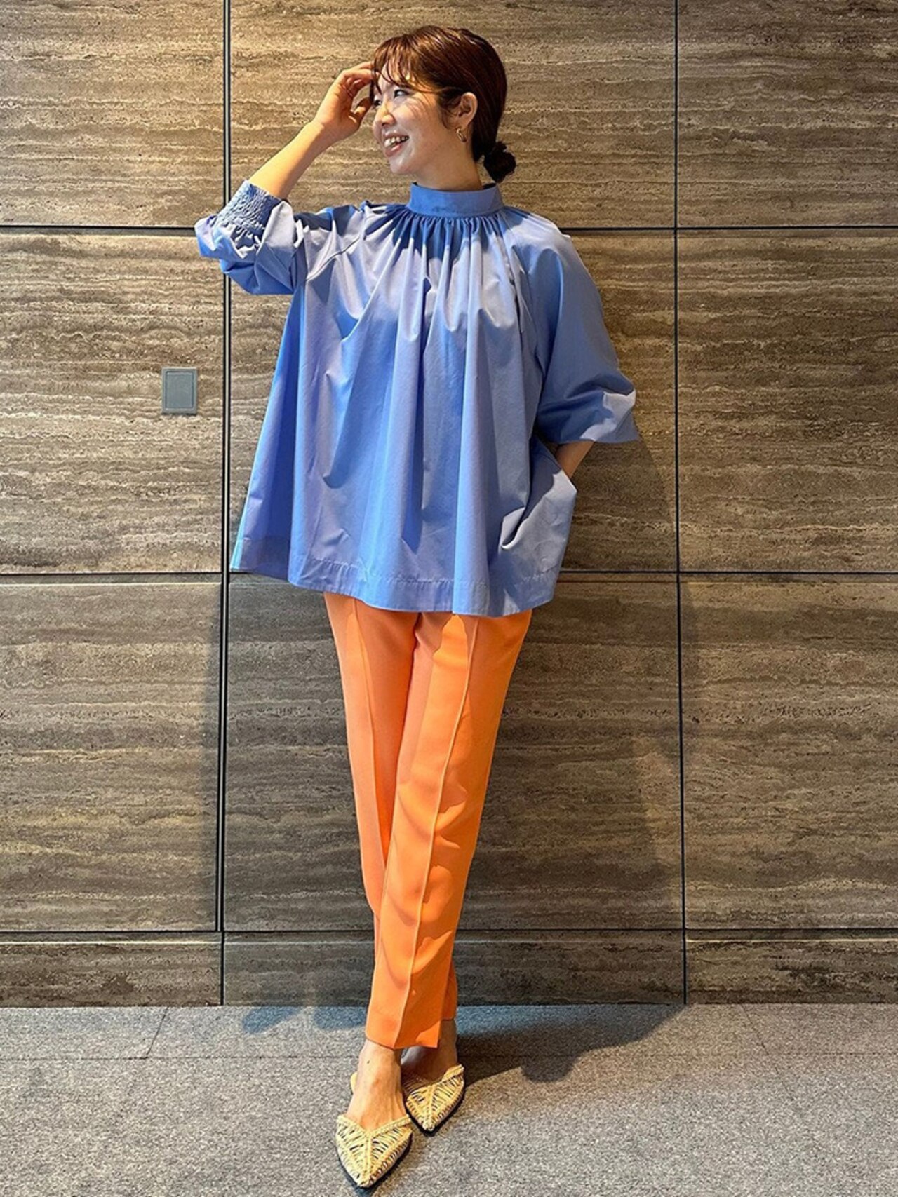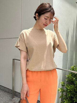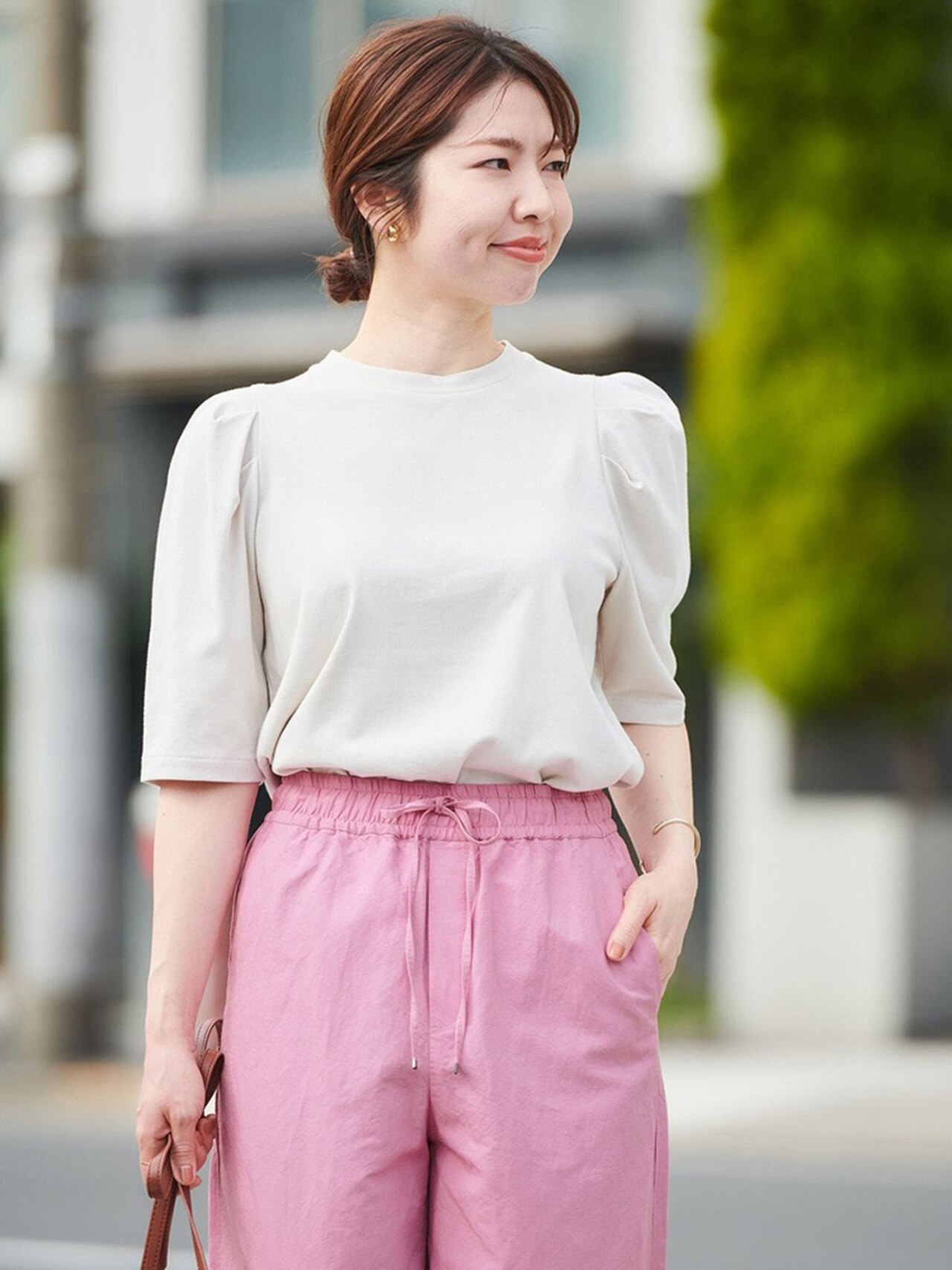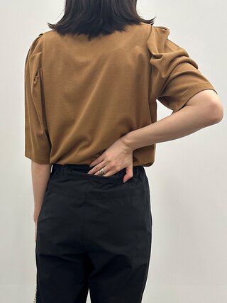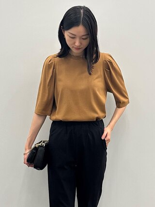 肌に優しい柔らかい素材ながら、程よくハリ感があるので、袖のボリューム感が綺麗に出ているのがポイントです。(身長161㎝、Mサイズ)