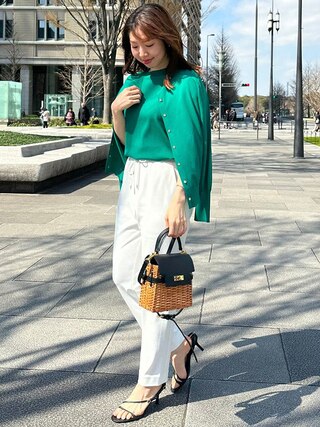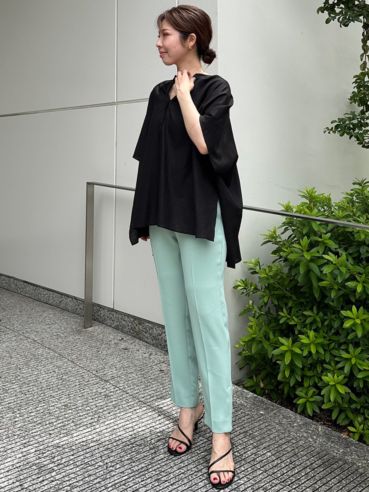 ミント×ブラックの大人の爽やかな色合わせコーデが完成。(身長161㎝、Mサイズ)