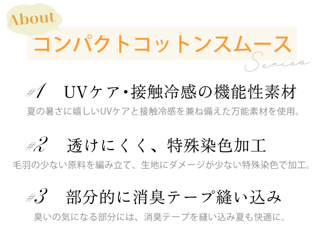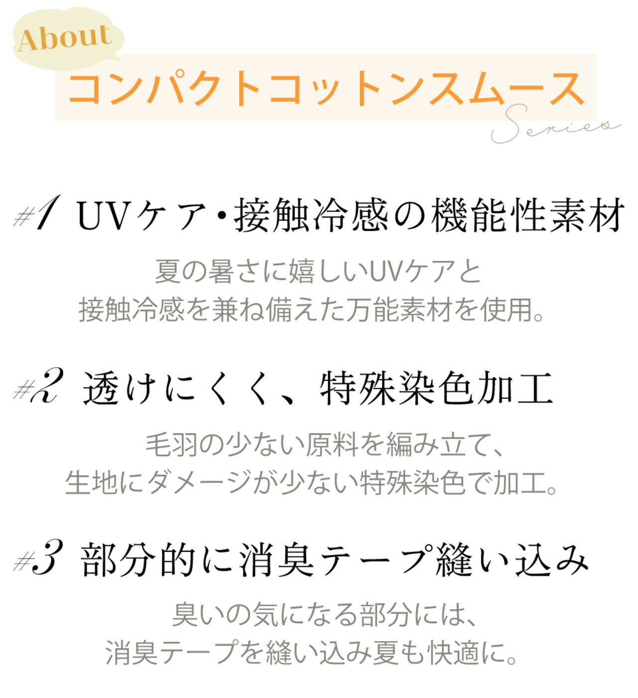 毎シーズン大好評のコンパクトコットンスムースが、トレンド感のあるデザインやカラーにアップデートし今年も登場。機能面を充実させ、さらに着やすく上品に進化した4型をご紹介いたします。