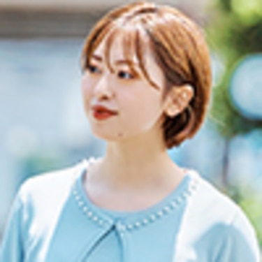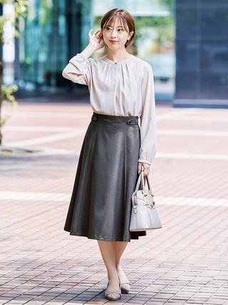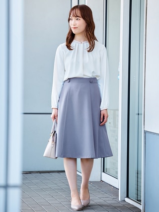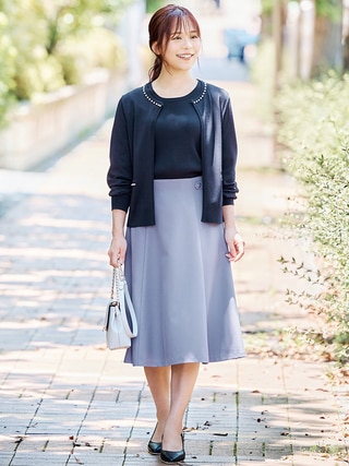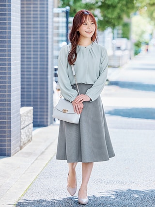 清潔感のあるミントグレーのアンサンブルはオフィスでも大活躍の予感。合わせのスカートは小柄さんにも嬉しい長すぎない丈感で、バランスが取りやすくおすすめです。