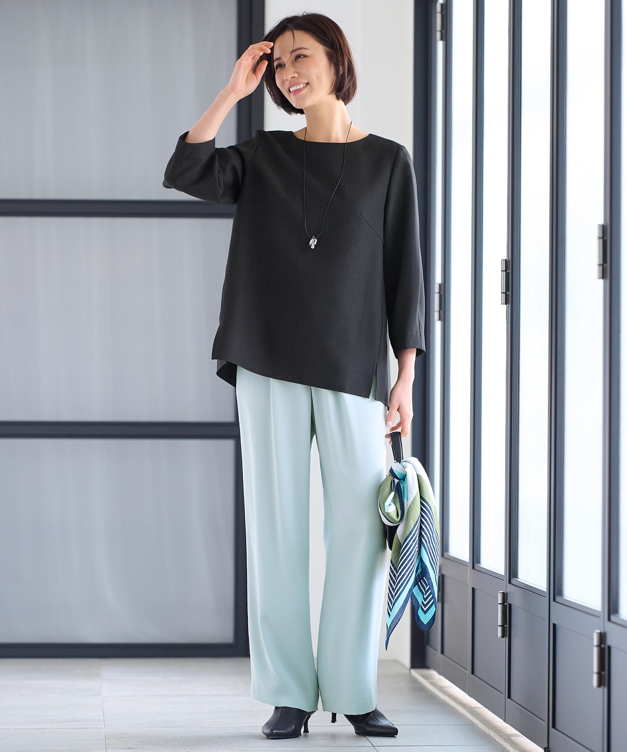 程よく立体的なフォルムが女性らしいブラウス。さらっとした着心地、シンプルながらシルエットに拘った一押しブラウスです。ライトグリーンのワイドパンツを合わせてこなれ感あるシックなスタイリングに。