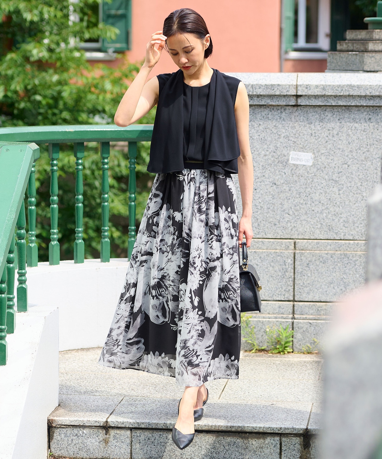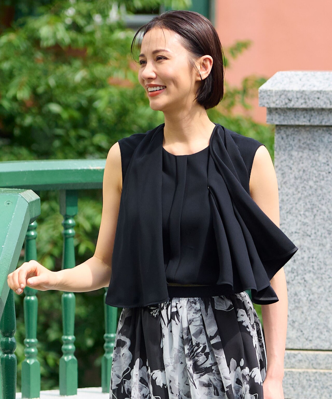 フレアなケープディティールが上品見えを叶えてくれるジョーゼットブラウス。動くたびゆれる立体感のあるシルエットが印象的。フラワープリントのスカートに合わせたモノトーンコーデで、会社帰りのお呼ばれにも。
