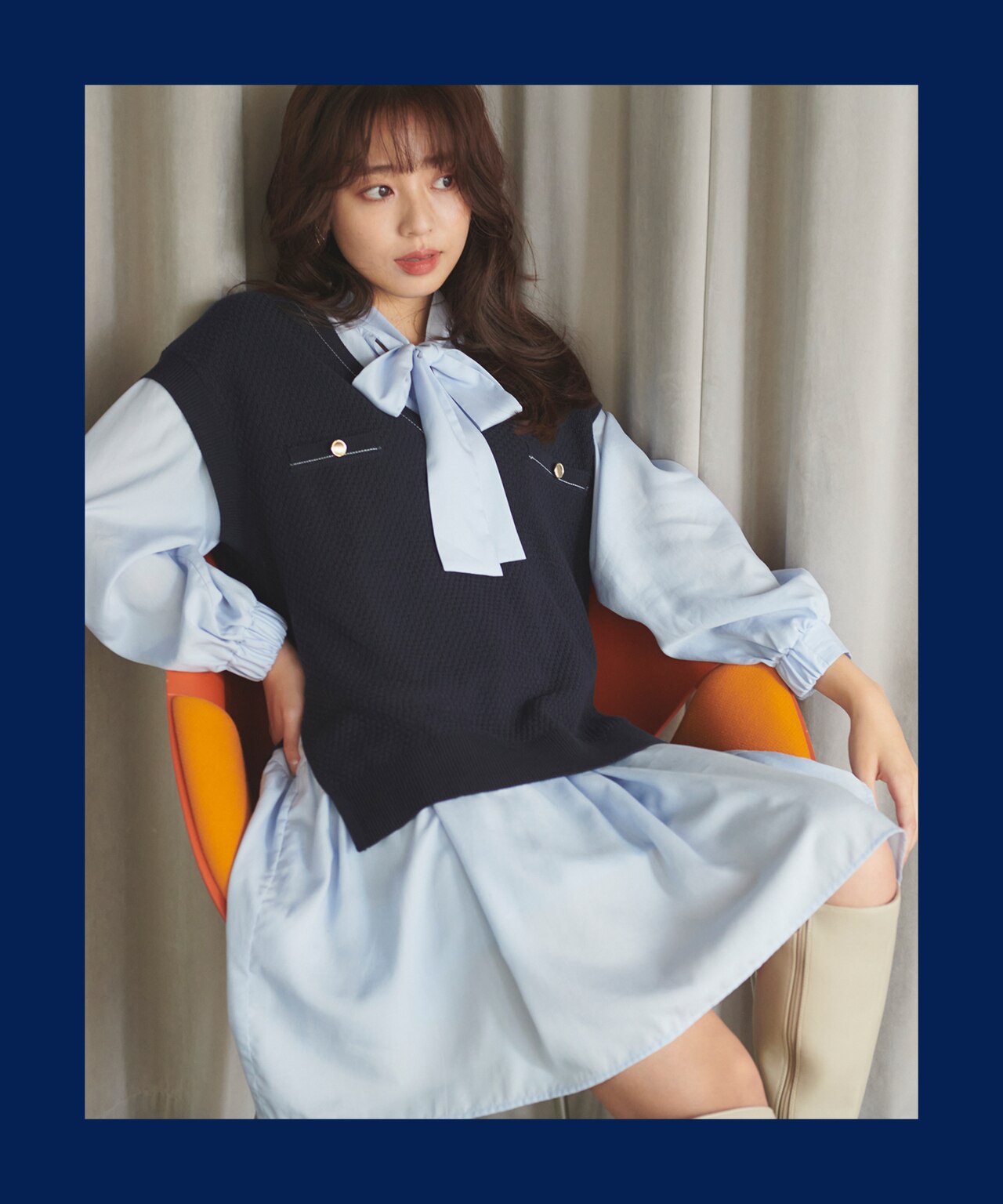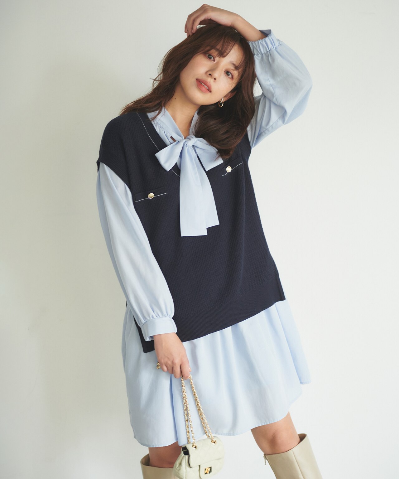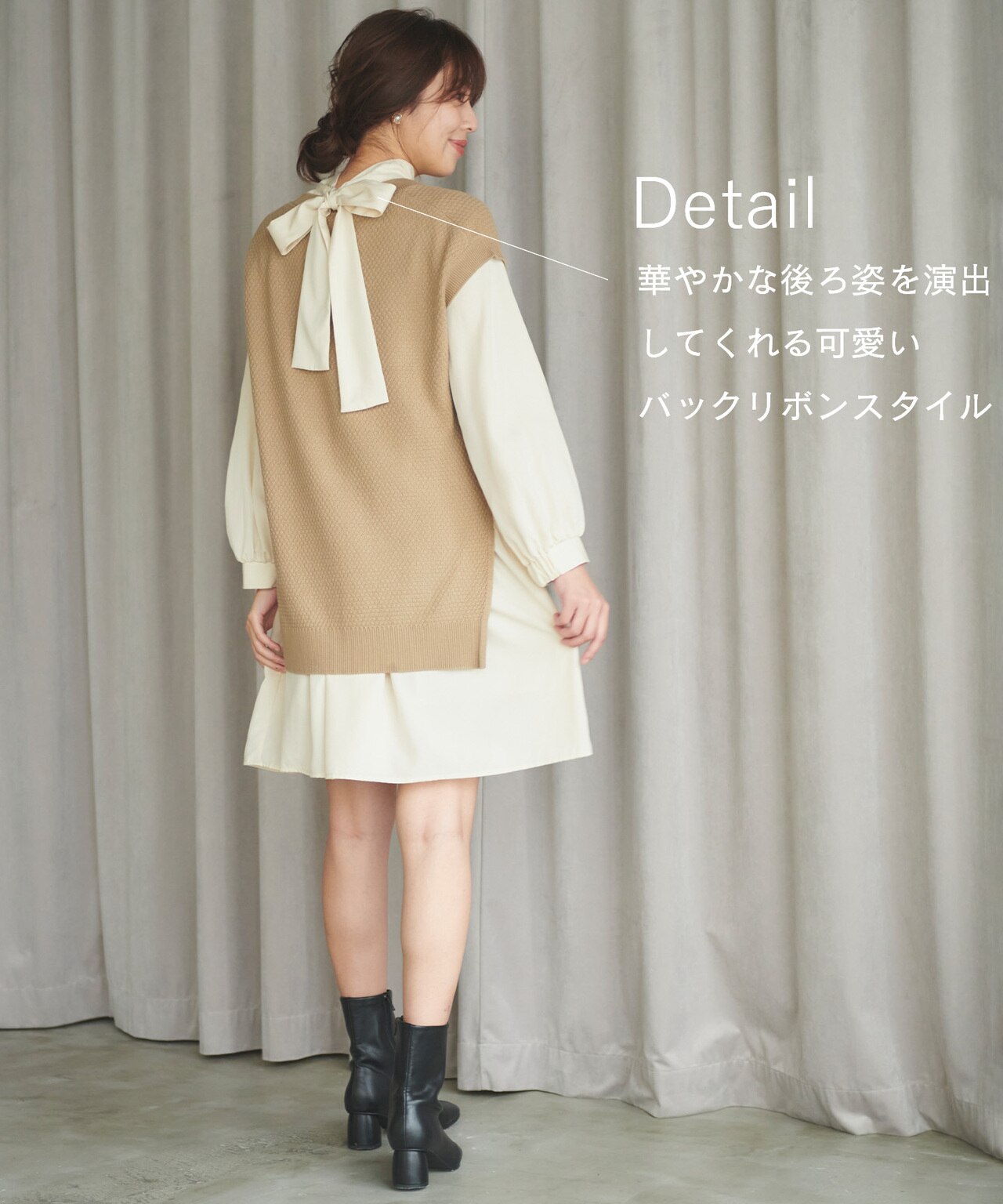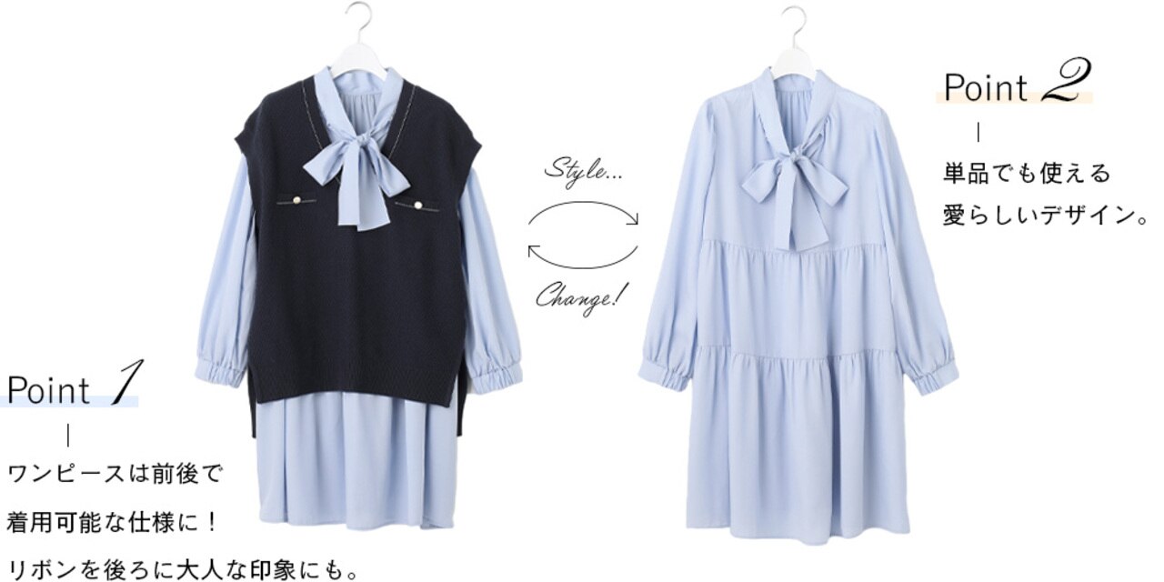 前後着用出来るボウタイデザインのワンピースにニットベストがついたセットアイテムが登場!