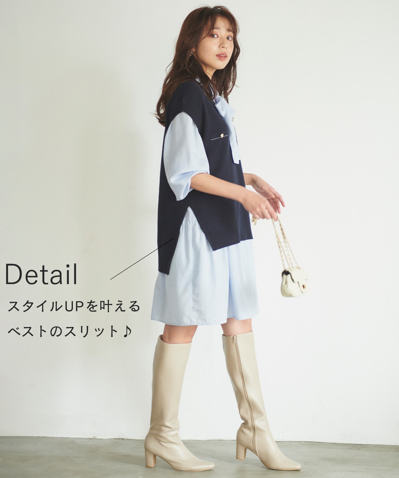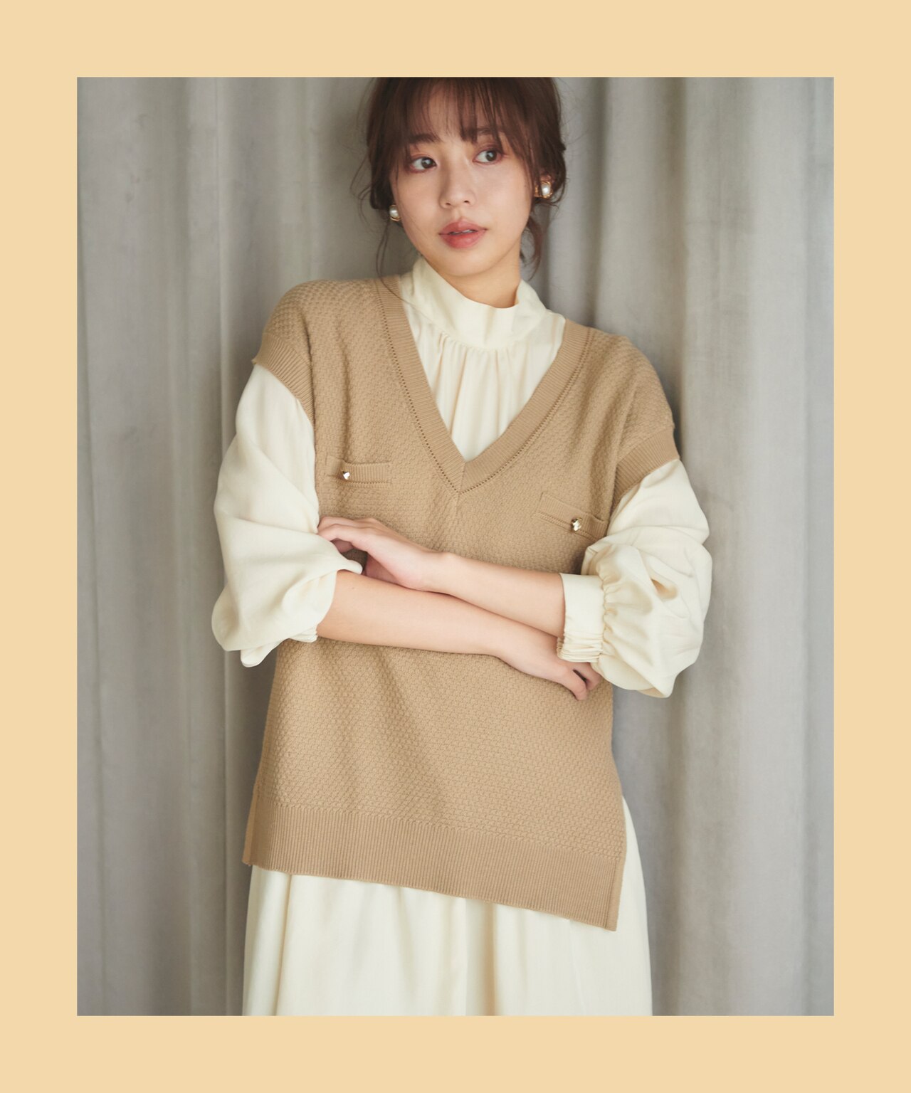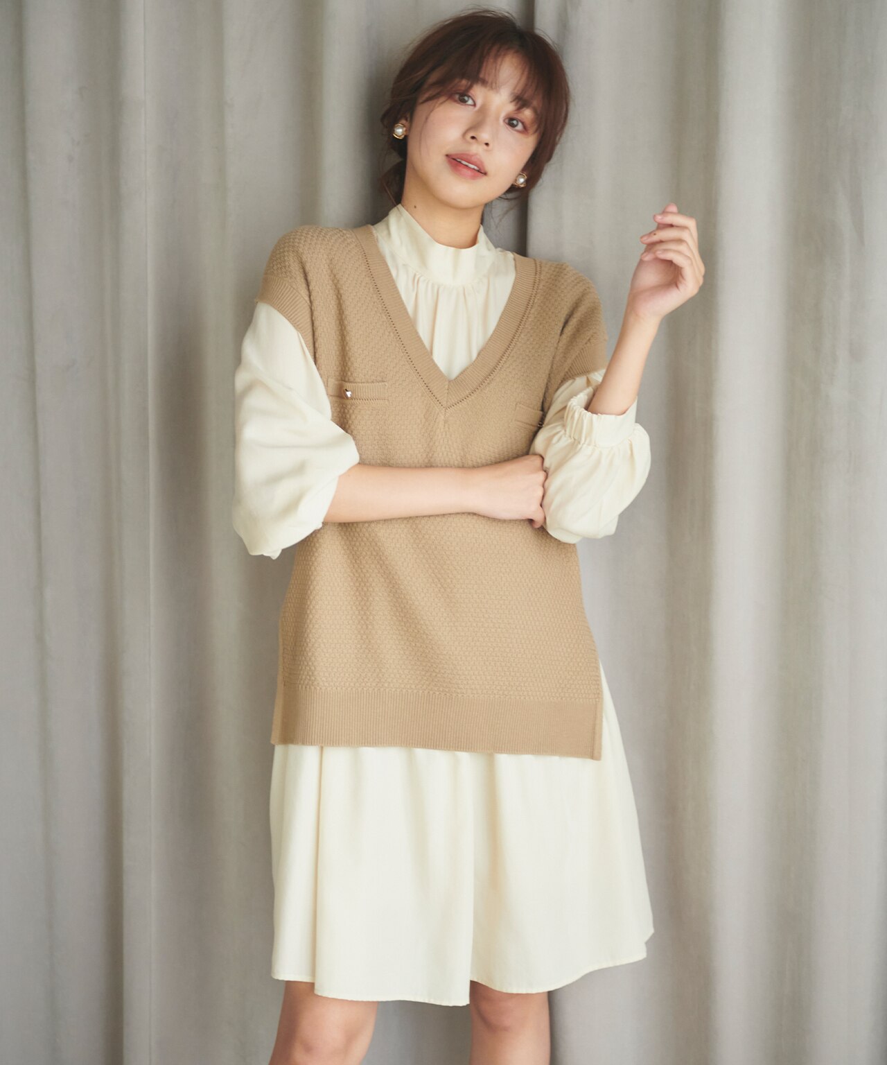 前後着用出来るボウタイデザインのワンピースにニットベストがついたセットアイテムが登場!