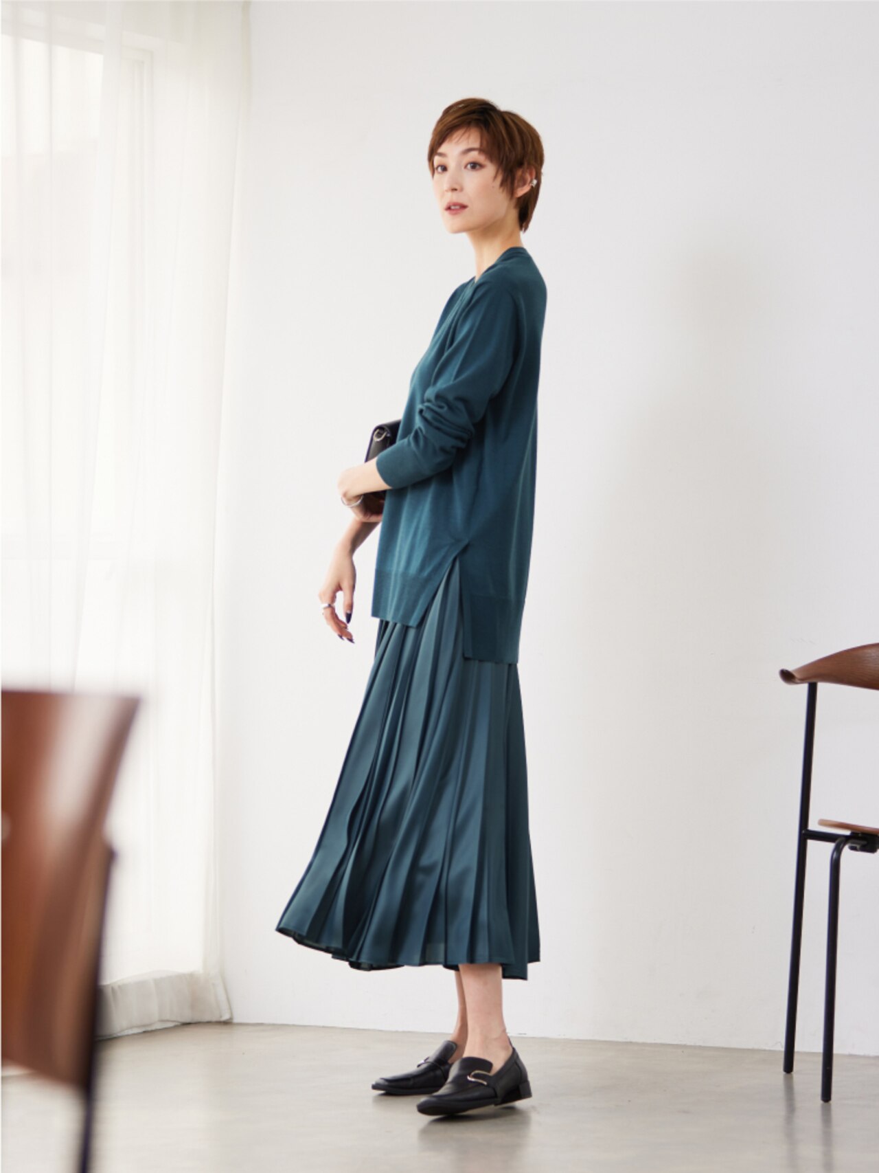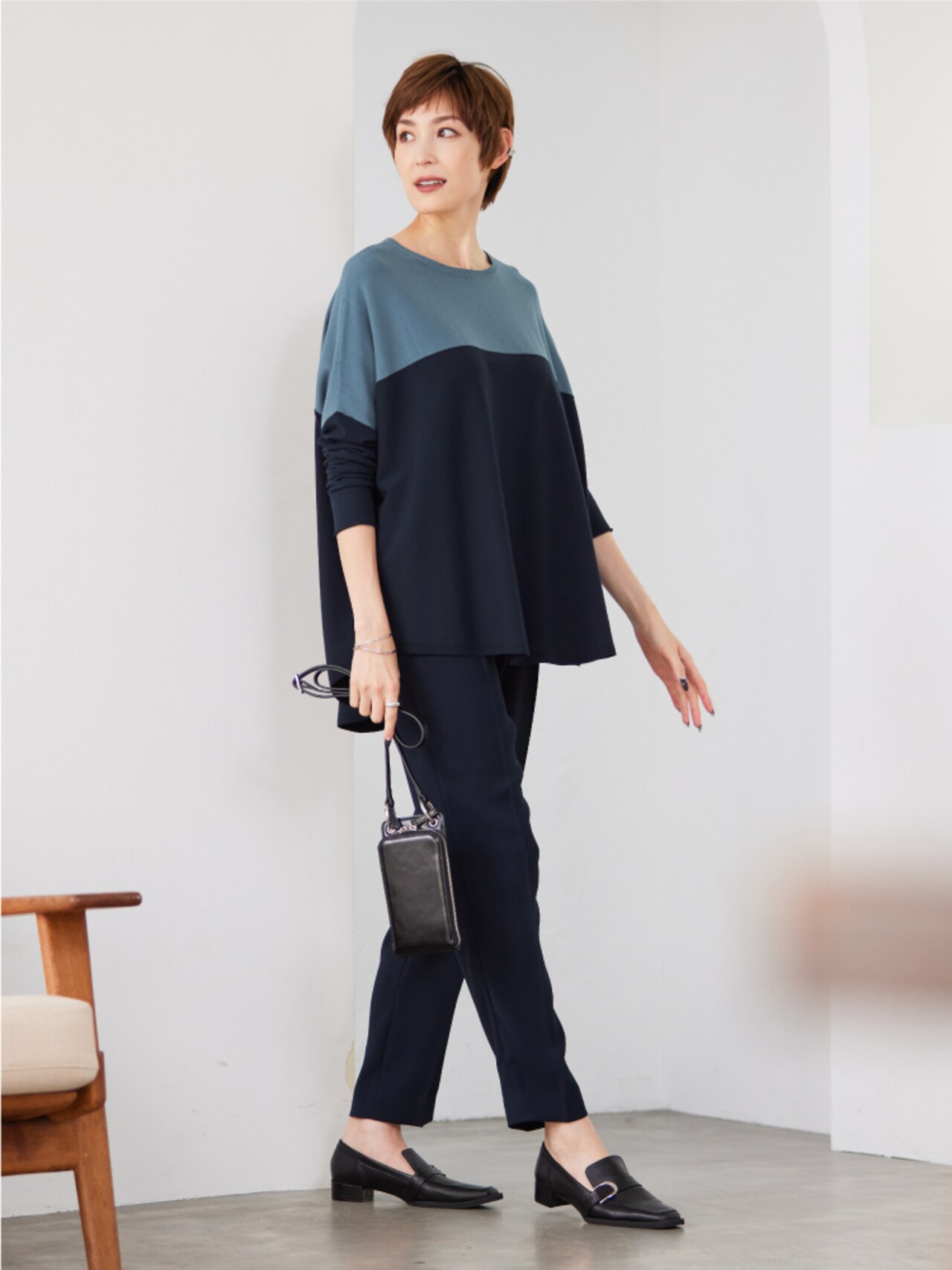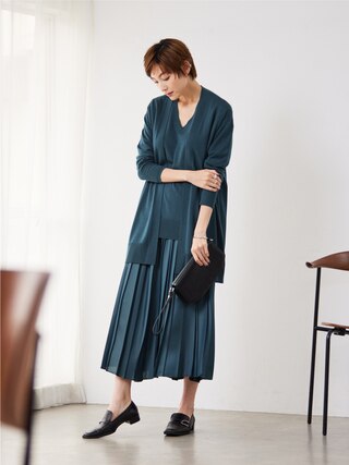 カーディガンとプルオーバーをアンサンブルで着用するのもおすすめ。ダルブルーでまとめて秋にぴったりの着こなしを。