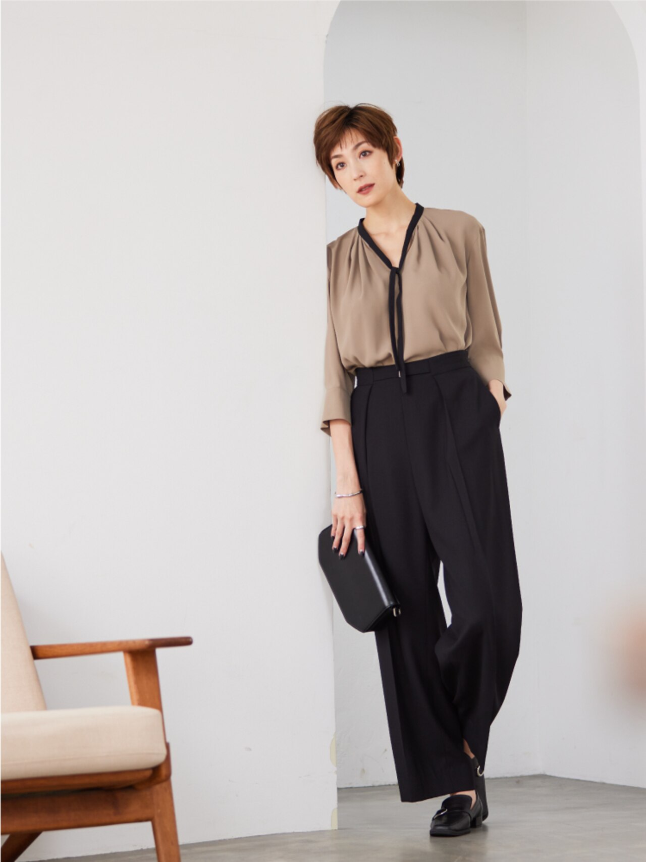 爽やかなサックスブルーのシャツに黒のベストを重ねると、ワンランク上のスタイリングに。前後差のあるニットベストは、いつものコーディネートを新鮮に更新してくれる。