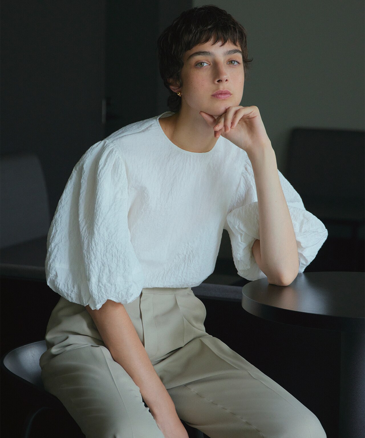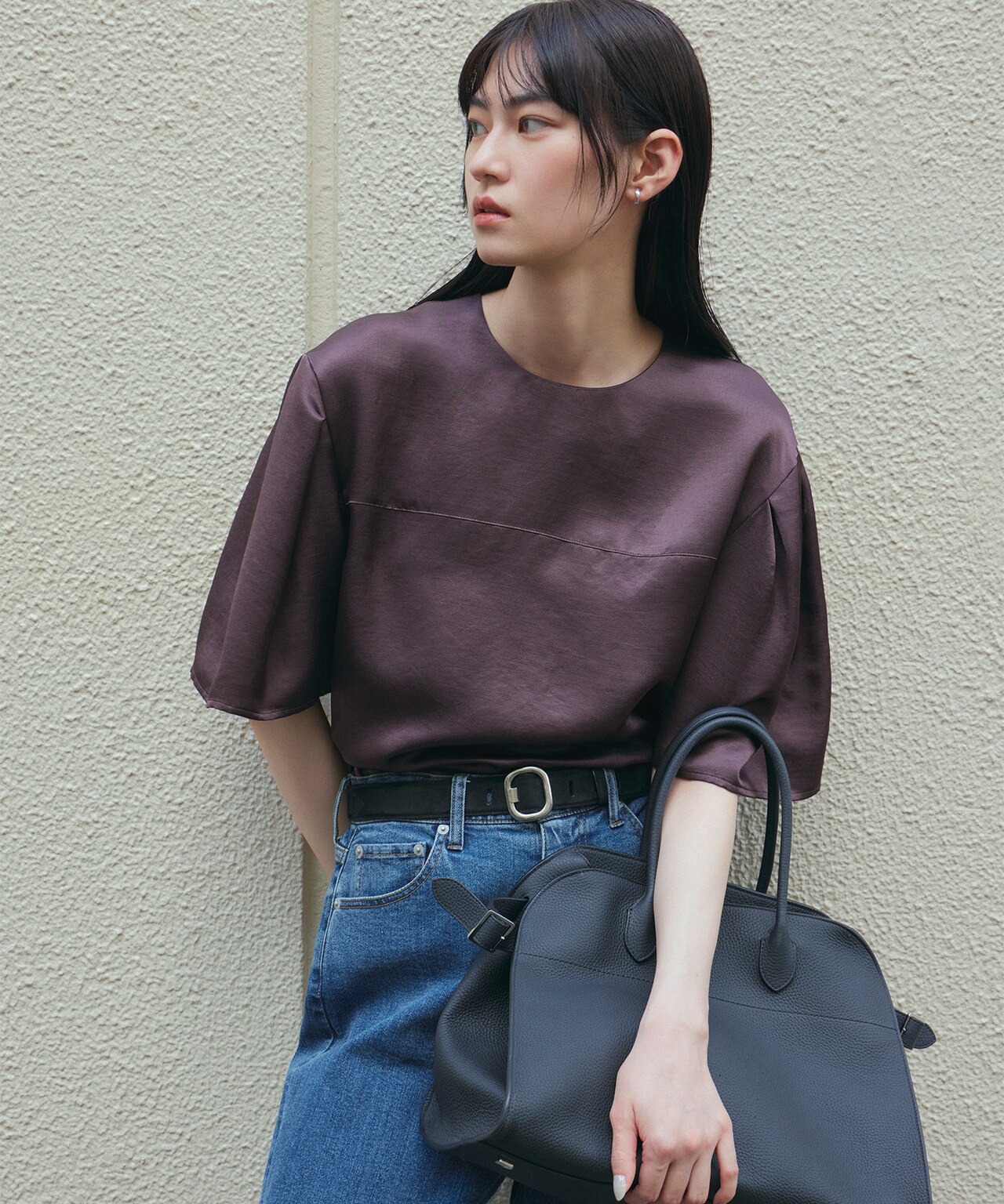 光沢感と柔らかな風合いのあるシアーボイル素材のブラウス。たっぷりと量感のある袖が動くたびに女性らしく、透け感がスタイルに奥行きをプラス。バックスタイルが大きく開いているので、甘くなりすぎないのもいい。トップスインもアウトもできる程よい丈感で、着こなしを選ばないのもポイントです。こんな風にホワイトデニムと合わせてカジュアルダウンするのもおすすめ!