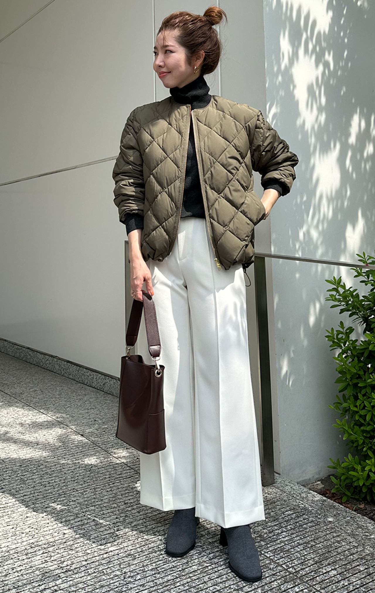 お出掛けにぴったりなカジュアルなスタイル。ワイドパンツとブーツで足元が覆われている時は、ブルゾンの袖を捲って抜け感を出すのがおすすめです!