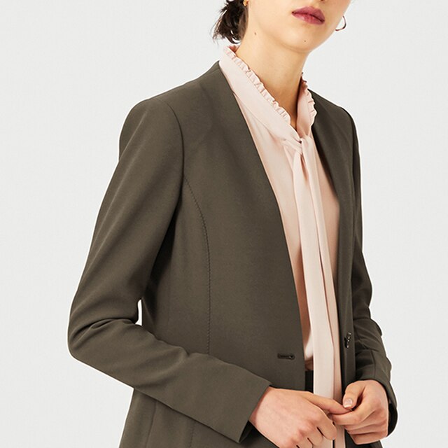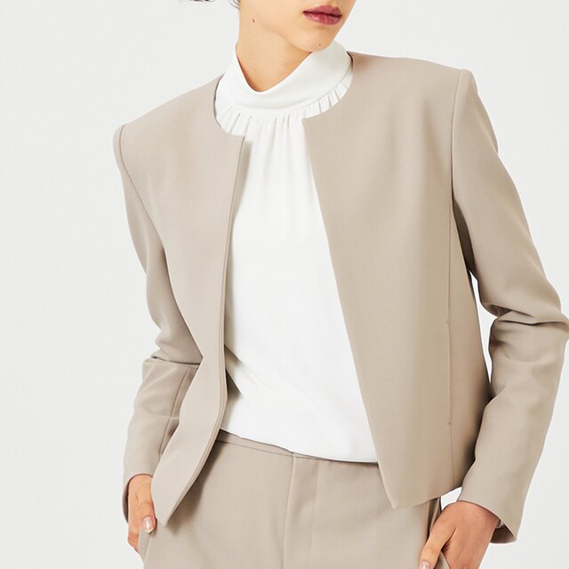 機能性とファッション性を兼ね備えており、透けにくく、発色性が良いイージーケア素材。定番素材ですが、今期は裏面を起毛することで見え感はそのままに膨らみのある秋冬仕様に仕上げました。美しいシルエットを作り出すシルエットは大人の女性に相応しいセットアップシリーズ。