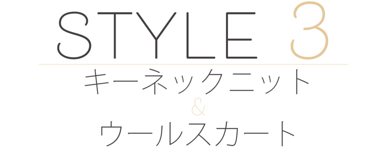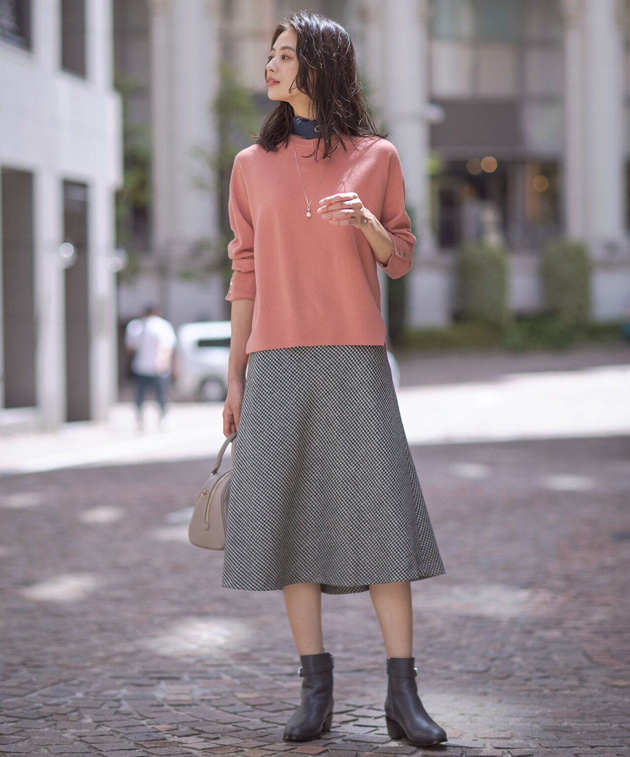 アラン柄が印象的で首元すっきりのキーネックニットに、すとんと落ちる美シルエットのスカートで、着ぶくれせずバランスの取れたニットスタイリング。