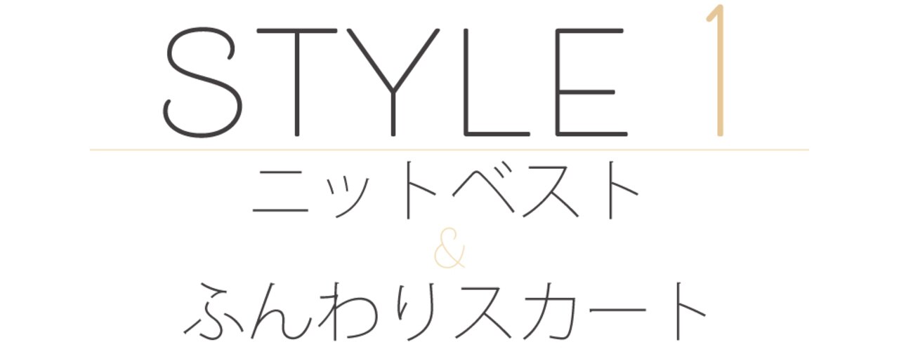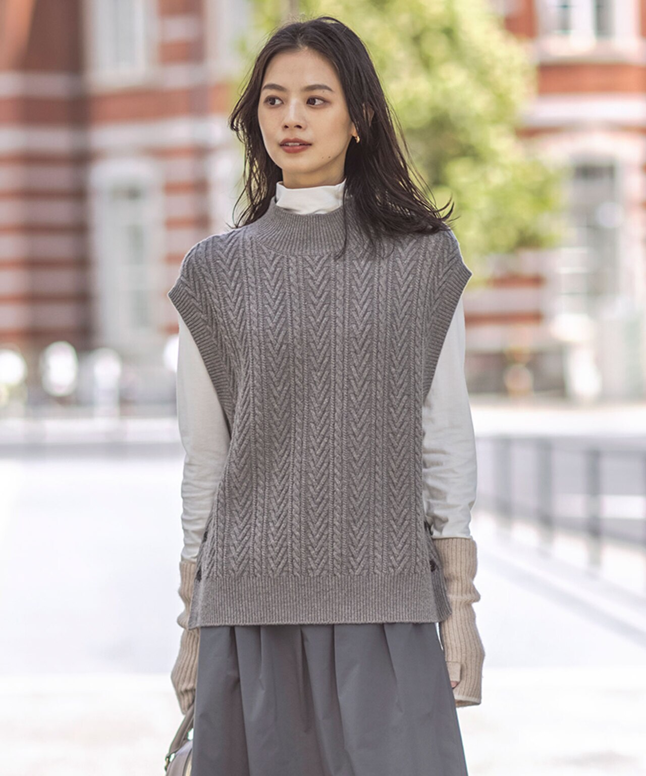 編地が綺麗なハイネックのニットベストにタートルカットソーを重ねた、トレンド感のあるベストスタイリング。