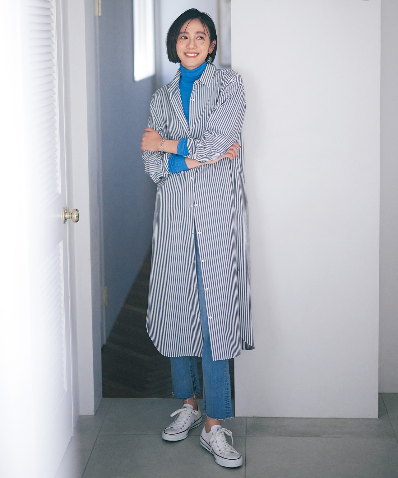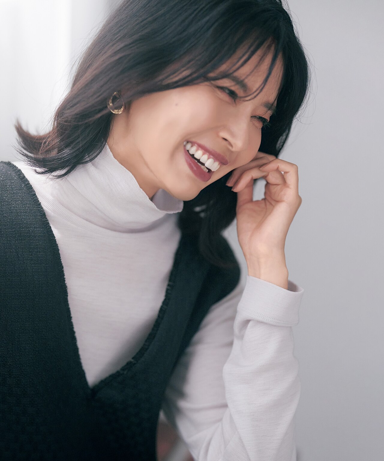 ゆとりのあるハイネックと長めに取られた袖部分をクシュっとさせることで、ニュアンスのある着こなしに。