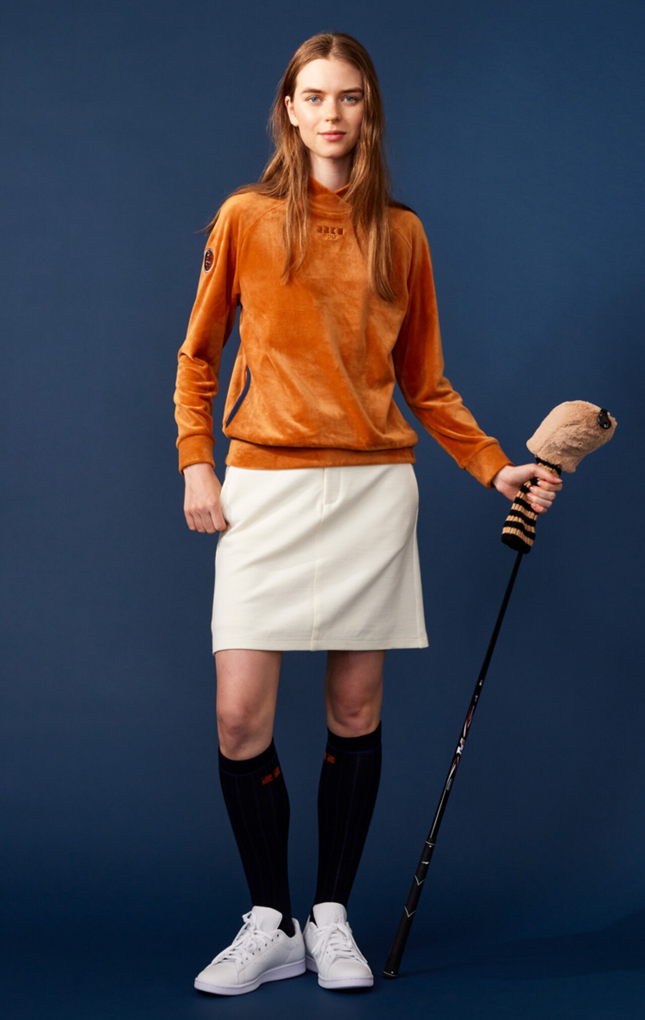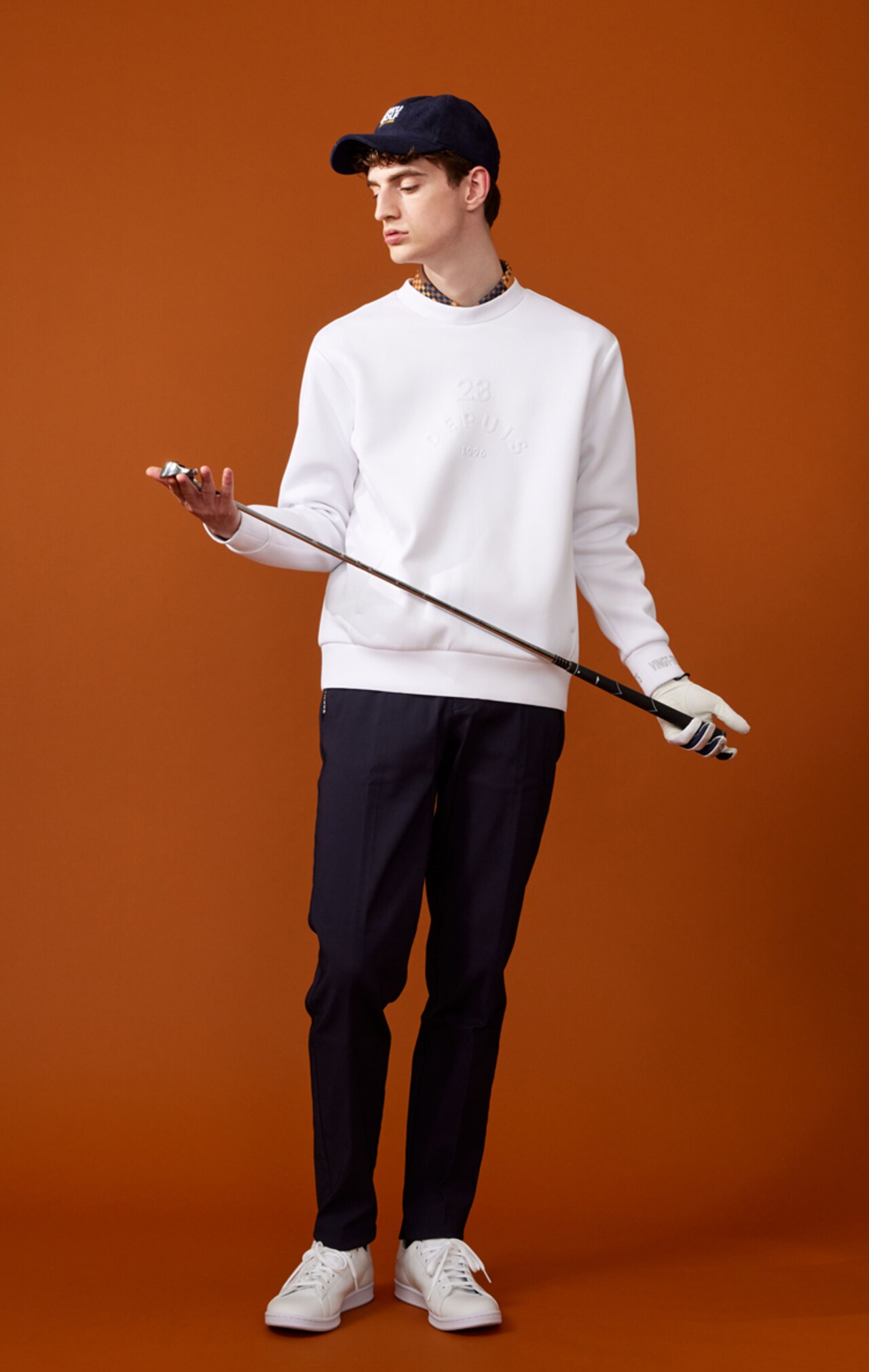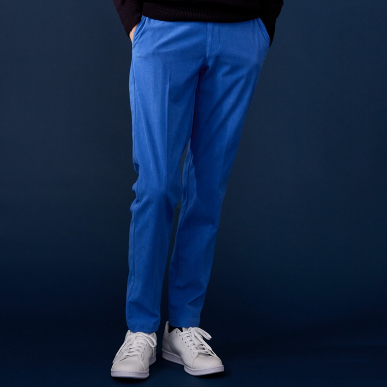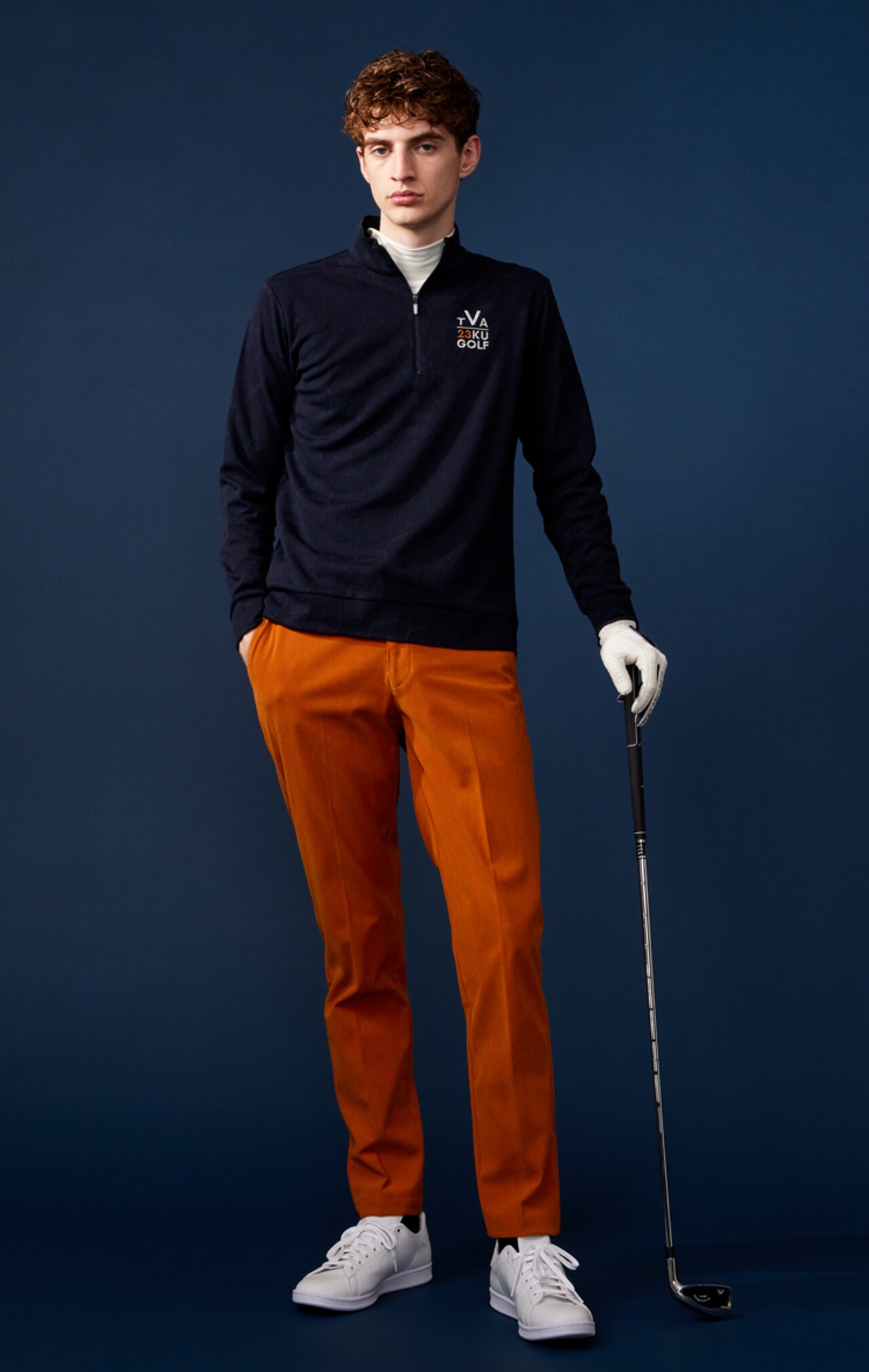 グリーン映えも狙えるカラーボトムで季節を彩るコーディネート。いつものパンツスタイルをアップデートさせてくれるコーデュロイ素材は今シーズンの一押しボトム。コーデュロイは固い…そんなイメージを覆す抜群のストレッチ性はゴルフブランドならではの自慢の一本。トレンド感あるハーフジップトップスで軽やかさのある秋の装いの完成です。