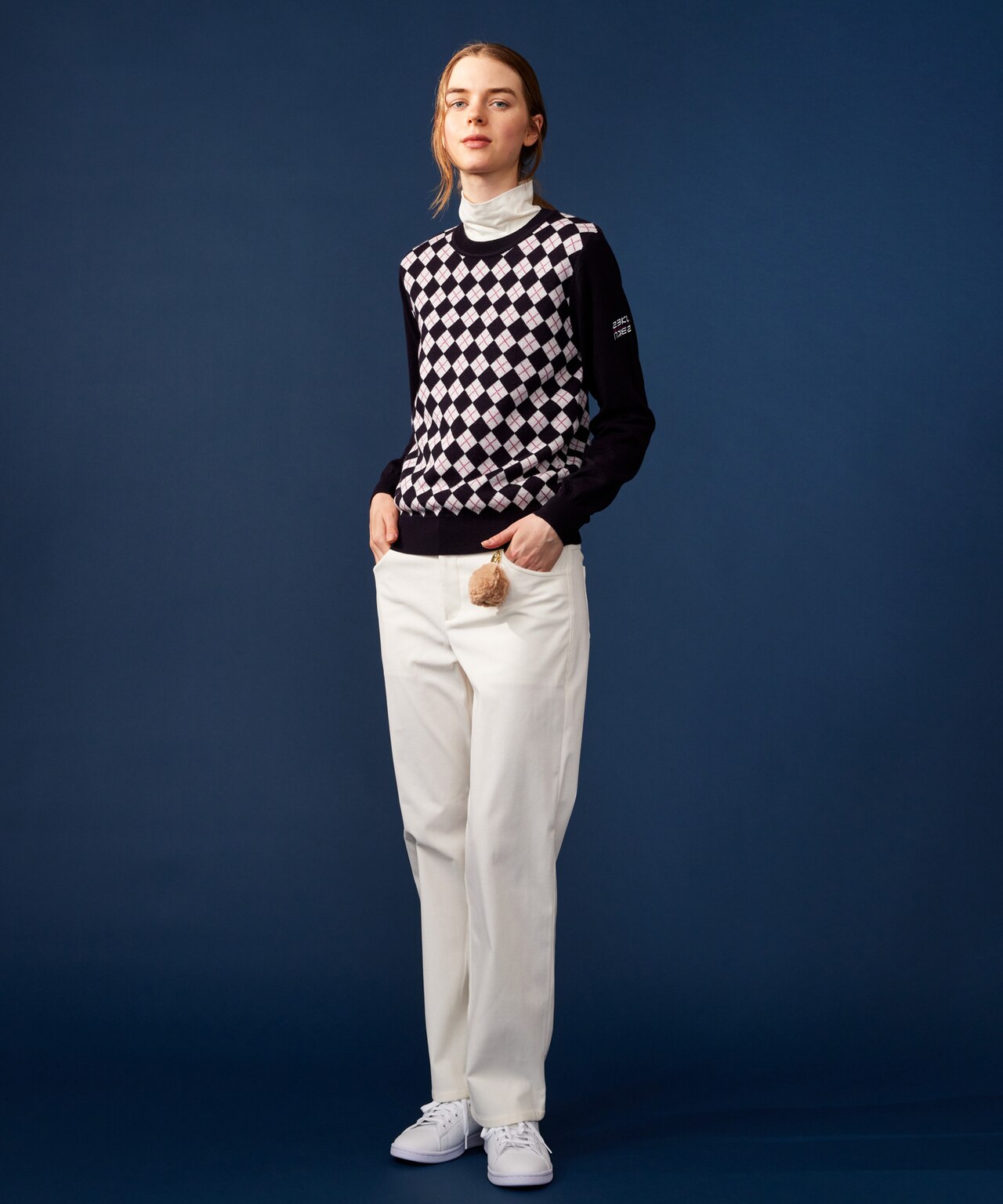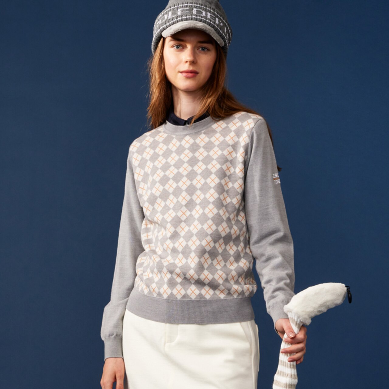 今季のアーガイル柄は小ぶりでレディな雰囲気が好感度。袖と裾は無地切り替えにすることで着合わせもしやすく飽きの来ないデザインにまとめました。編み目が緻密な12ゲージのハイゲージ、ナチュラルな光沢感が上品。ジャケットインにして、ゴルフの行き帰りにもおすすめです。