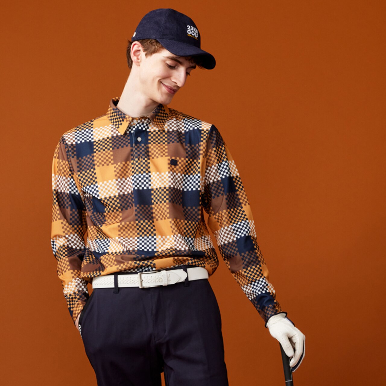 無地ライクなプルオーバーは、立体的なエンボスロゴでアクセントの効いた一枚。ポリエステル素材なので軽くて柔らか、まだ汗ばむ秋にもドライタッチで通気性も良好◎秋のレイヤードアイテムとしては最適な素材感です。インナーにはチェック柄シャツを入れ、首元から柄をちらりと。昼からはシャツ一枚でがらりと印象チェンジしてプレイを楽しんで◎