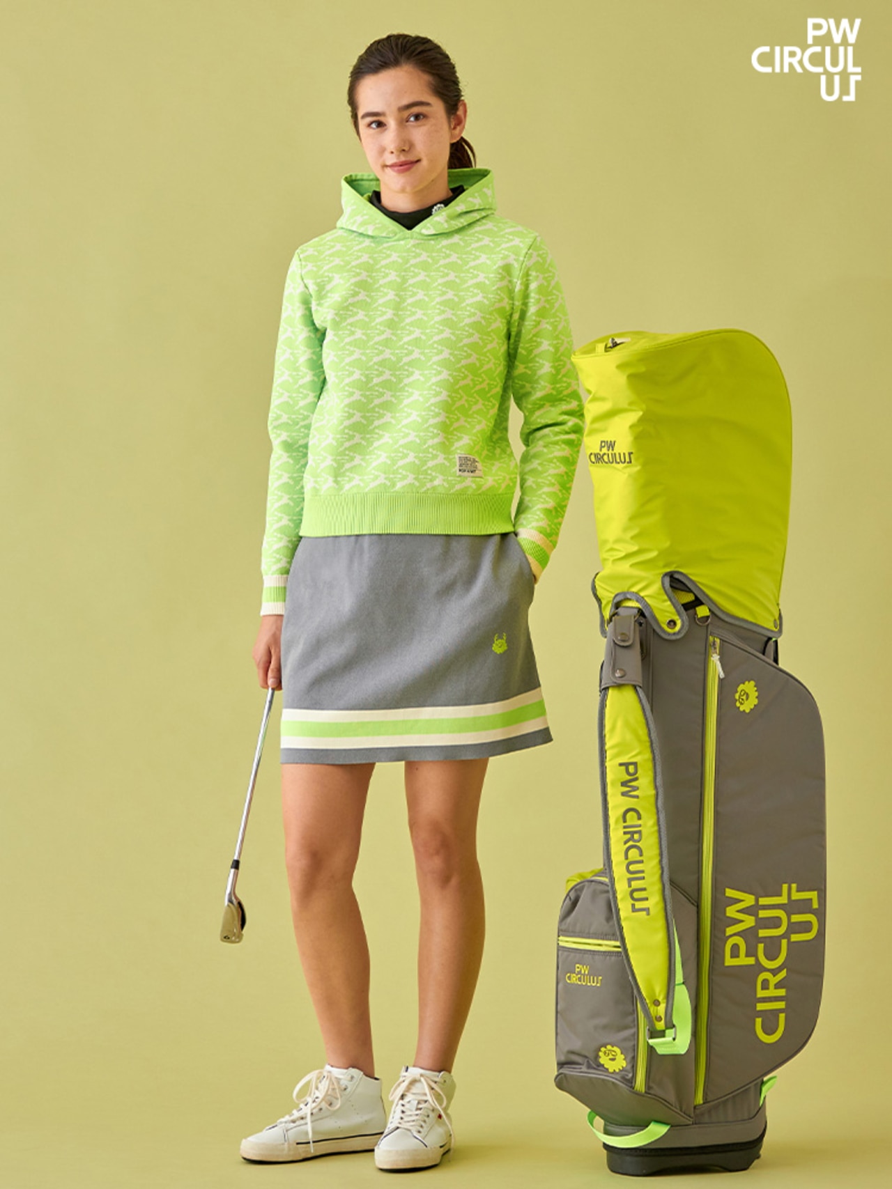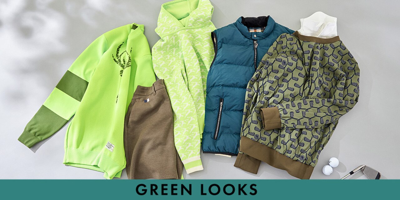 季節感あるカーキ、コースでも存在感を放つライムグリーンなど、山遊びが流行っている昨今、山を散策する日に合うようなグリーン系アイテムが豊作。遠くからでも印象に残る柄やカラーを取り入れて元気&ヘルシーなスタイルを目指して。