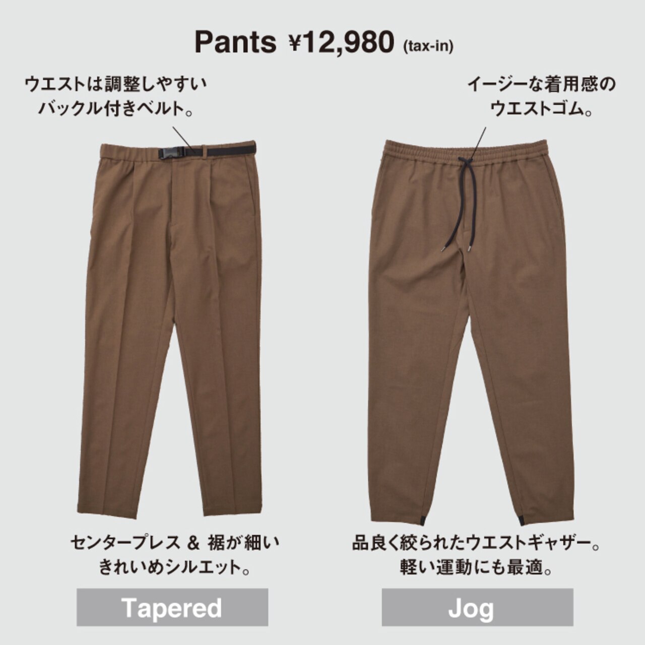 スラックス見えな上品デザインの「テーパードパンツ」と、足がきれいに見えるシルエットの動きやすい「ジョグパンツ」の2種をご用意。パンツはS1〜XL2までの8サイズ展開。S・M・L・XLそれぞれのサイズに丈の長さが2タイプずつ設けているので、ジャストフィットな丈をお選びいただけます。