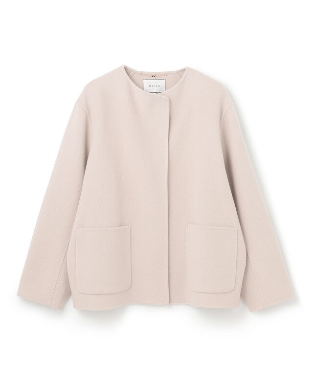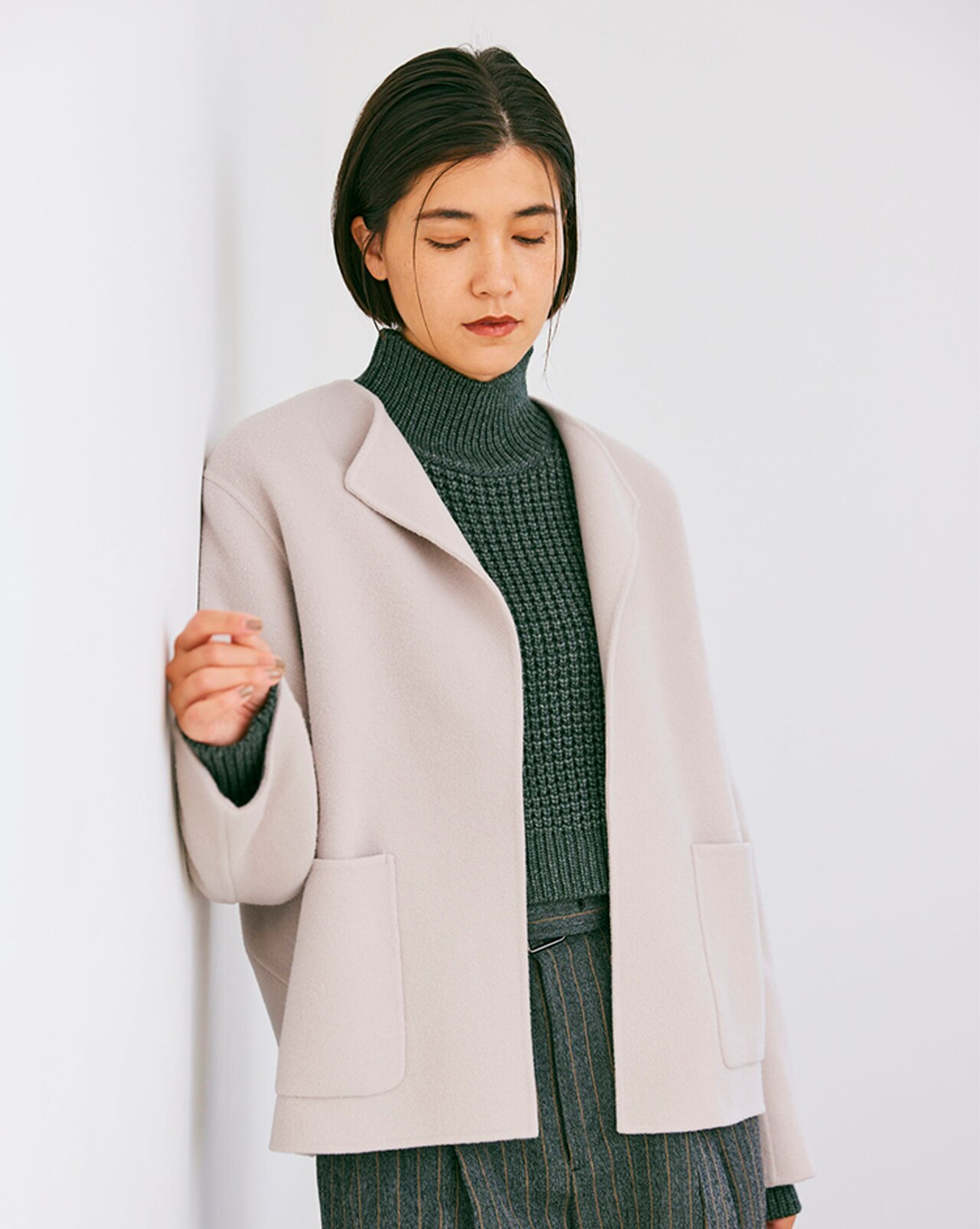 留めがない自然に襟が返るデザインのショートコート。バックスタイルはヒップあたりに脇からダーツを入れ、丸みのあるシルエットを作ります。きめ細やかで薄く柔らかなリバー素材です。ウールの天然素材ならではの風合いが出ている軽い着心地の良い素材です。