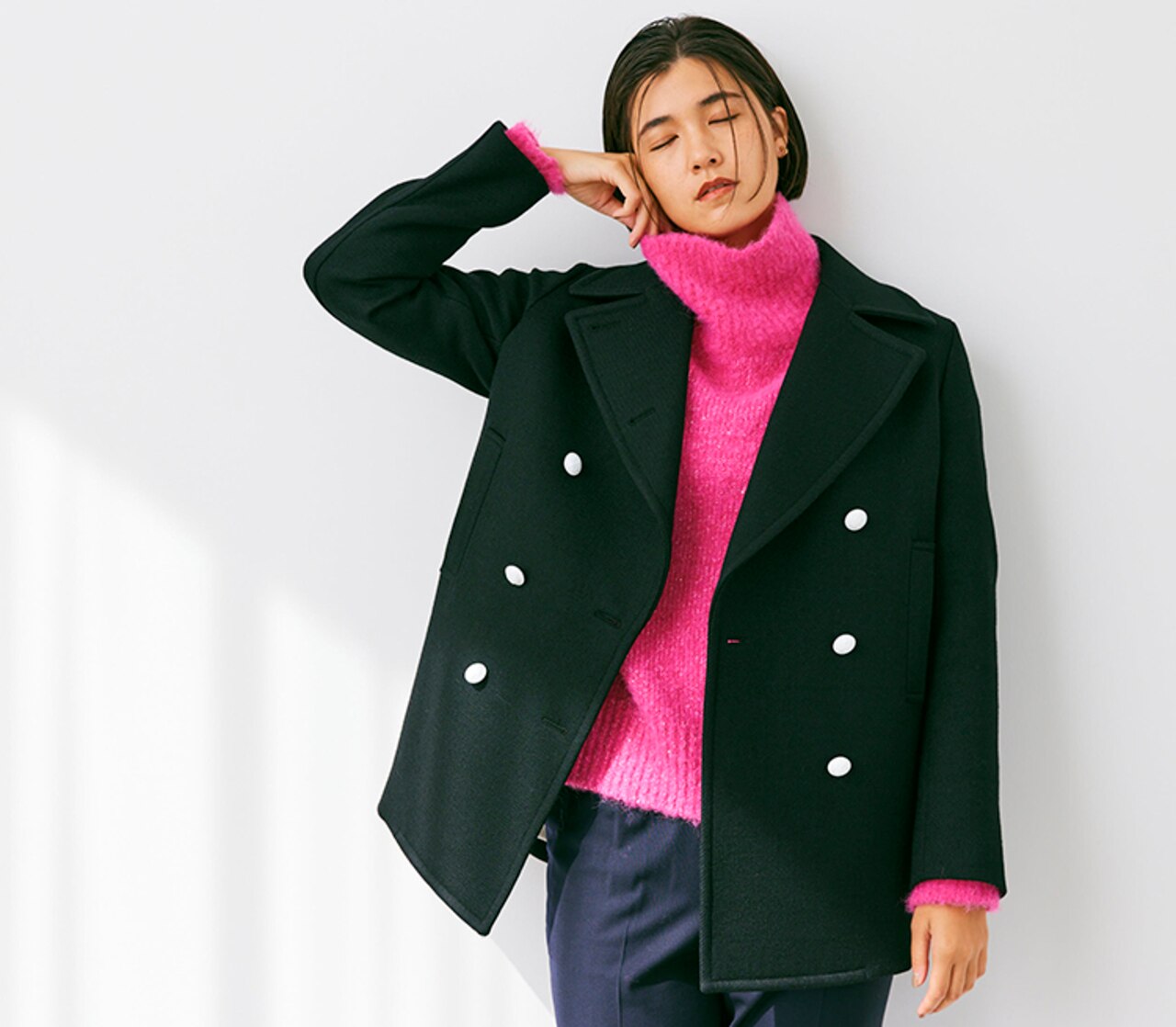 丸みのあるフォルムとヒップ下で少し内に入るコクーンシルエットのPコート。エンブレム入りのボタンがさりげないポイント。綺麗な綾目が特徴のウール素材で、クリアな表情とハリのある素材で構築的なフォルムを表現しています。