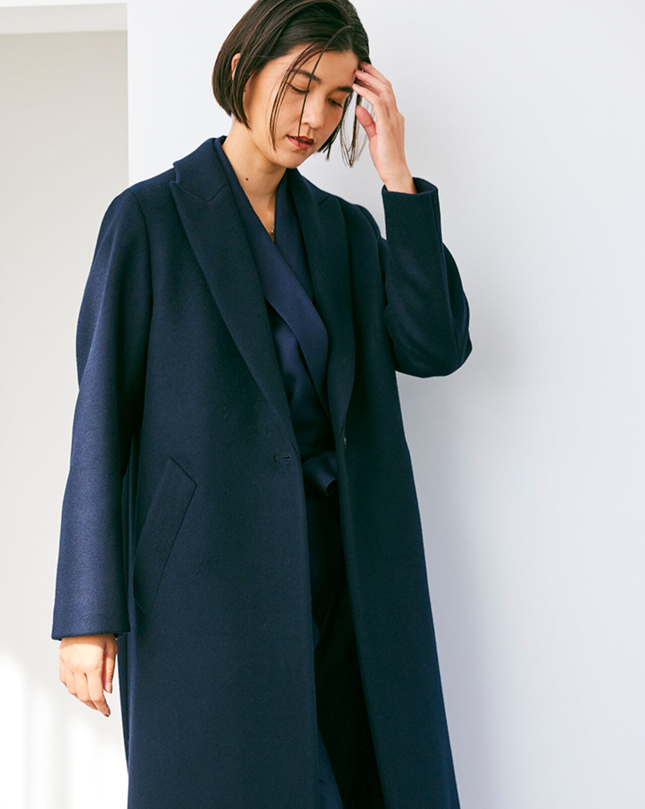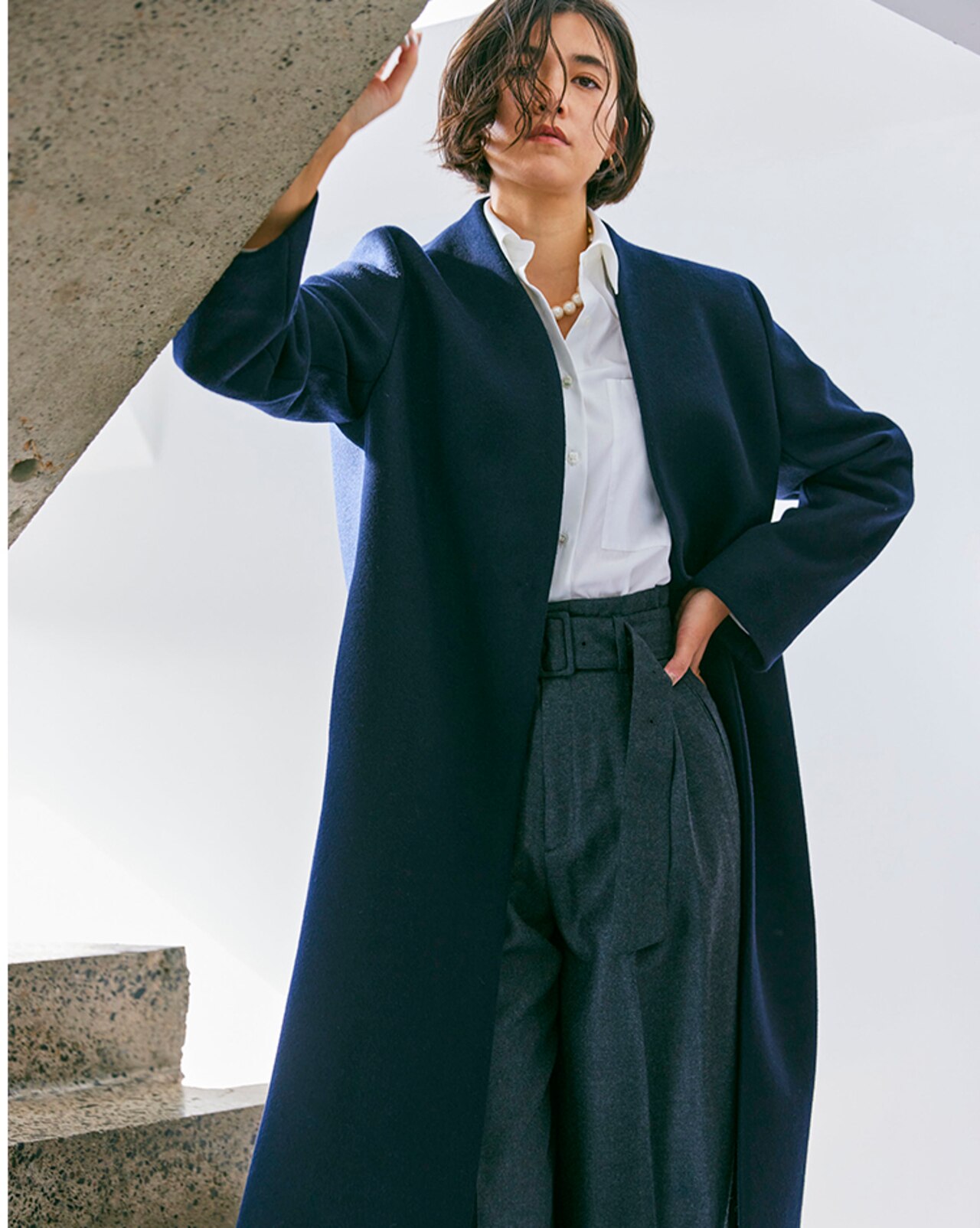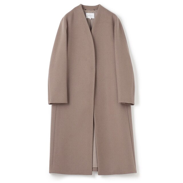 一つボタンのノーカラーロングコートで、肩にはパッドを入れずになだらかな肩線を作りネックラインに沿った美しいストレートなシルエットです。