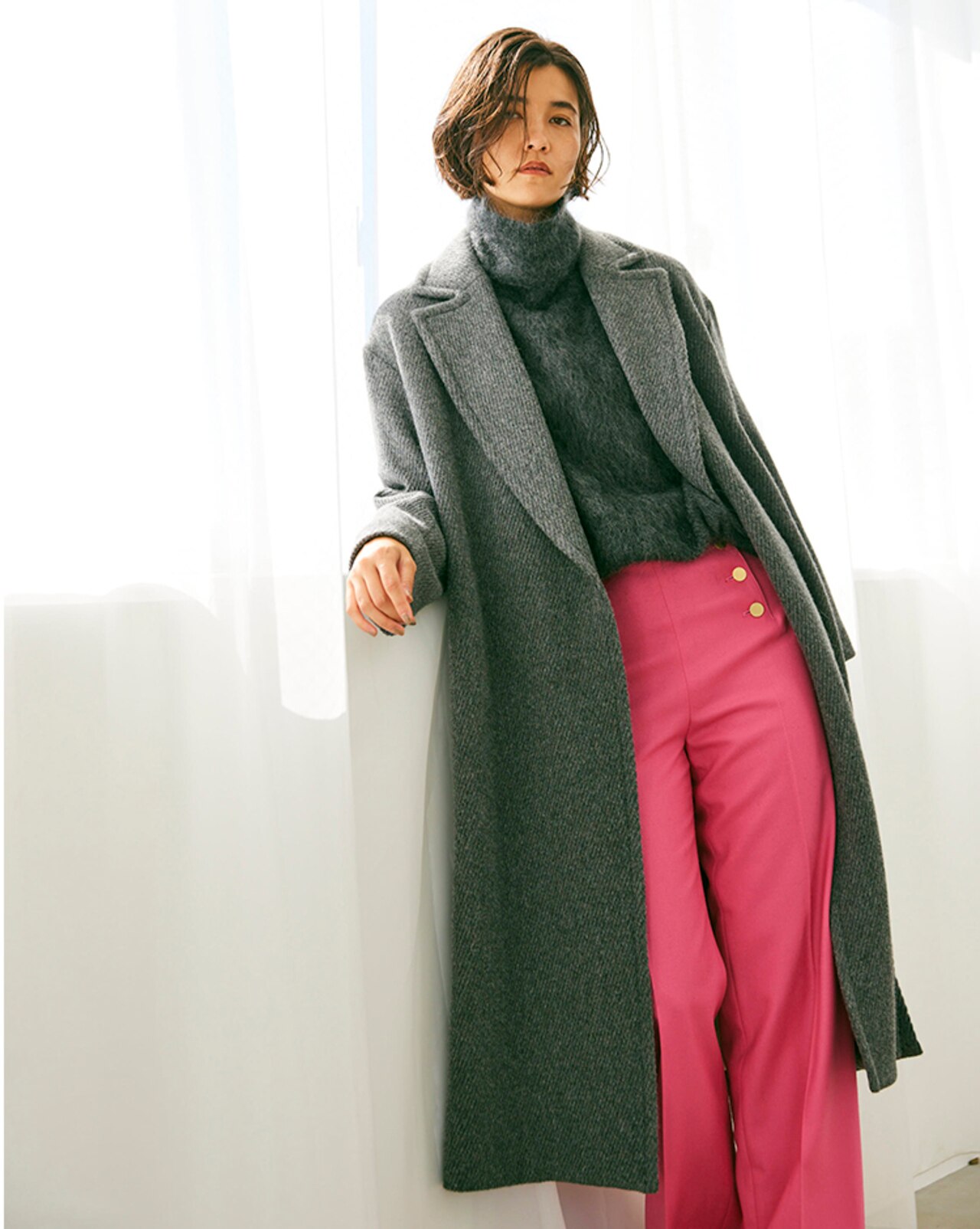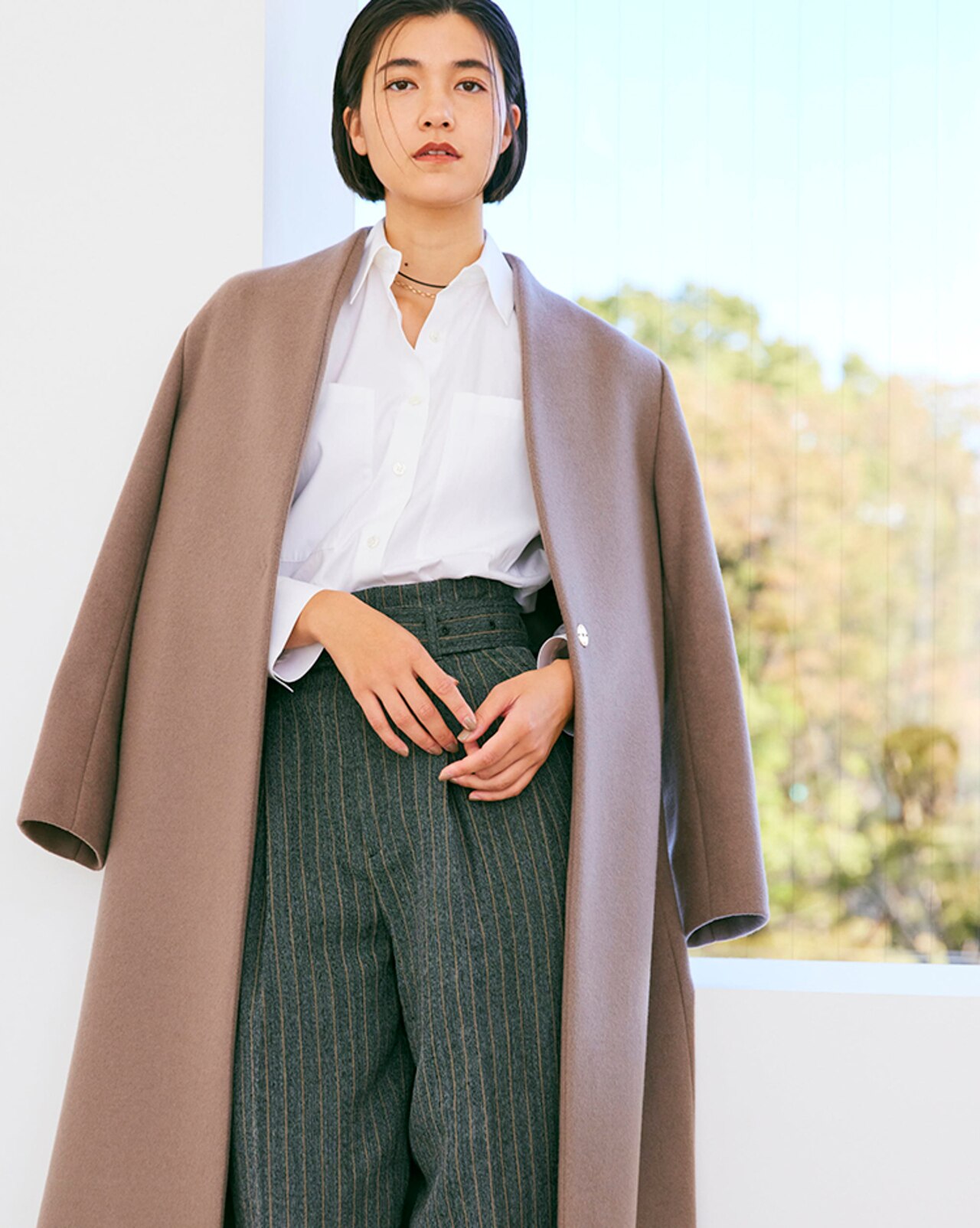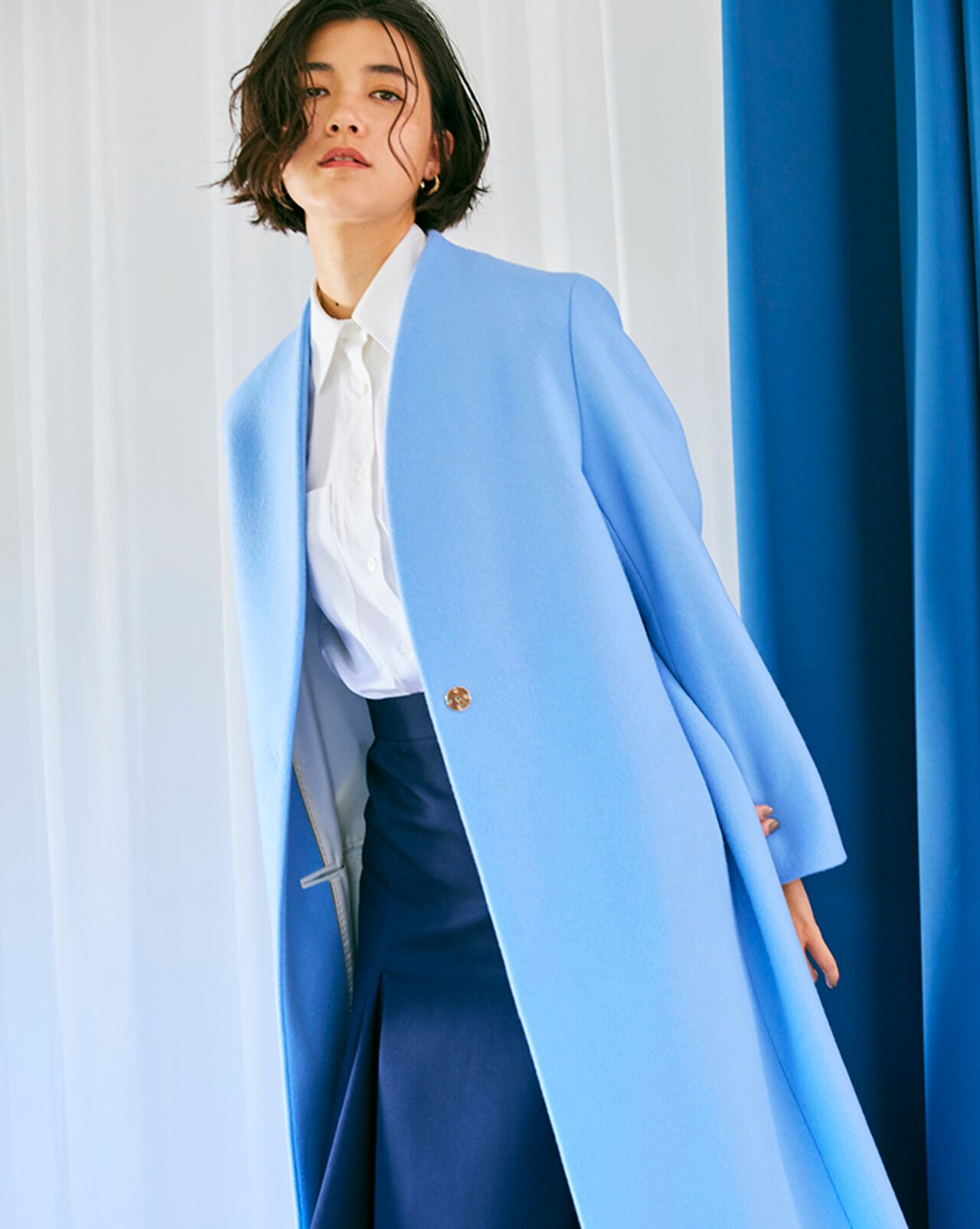 一つボタンのノーカラーロングコートで、肩にはパッドを入れずになだらかな肩線を作りネックラインに沿った美しいストレートなシルエットです。