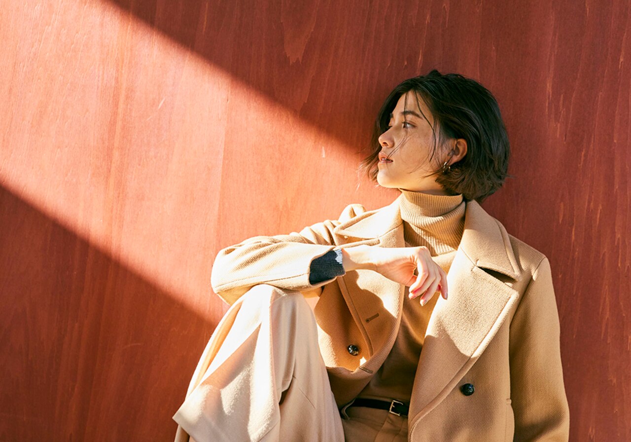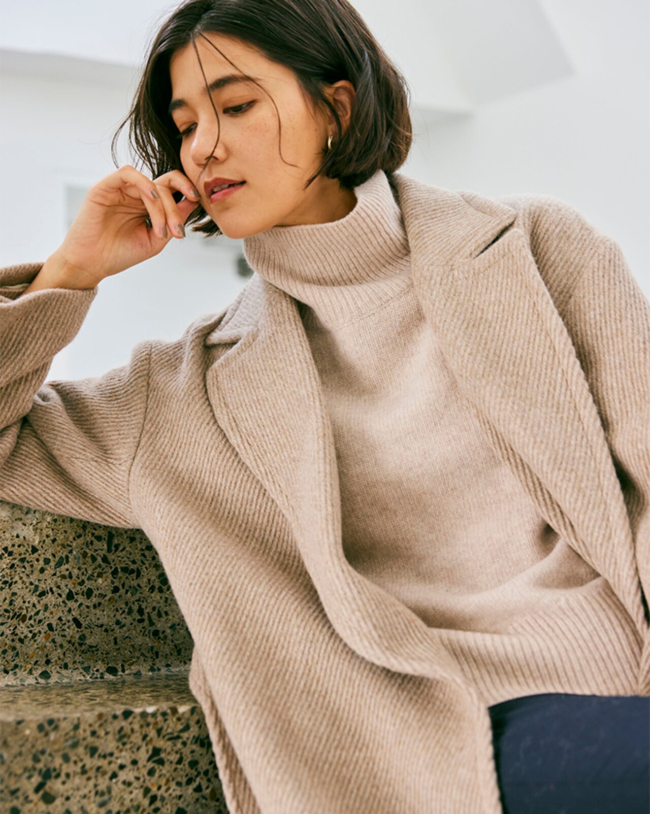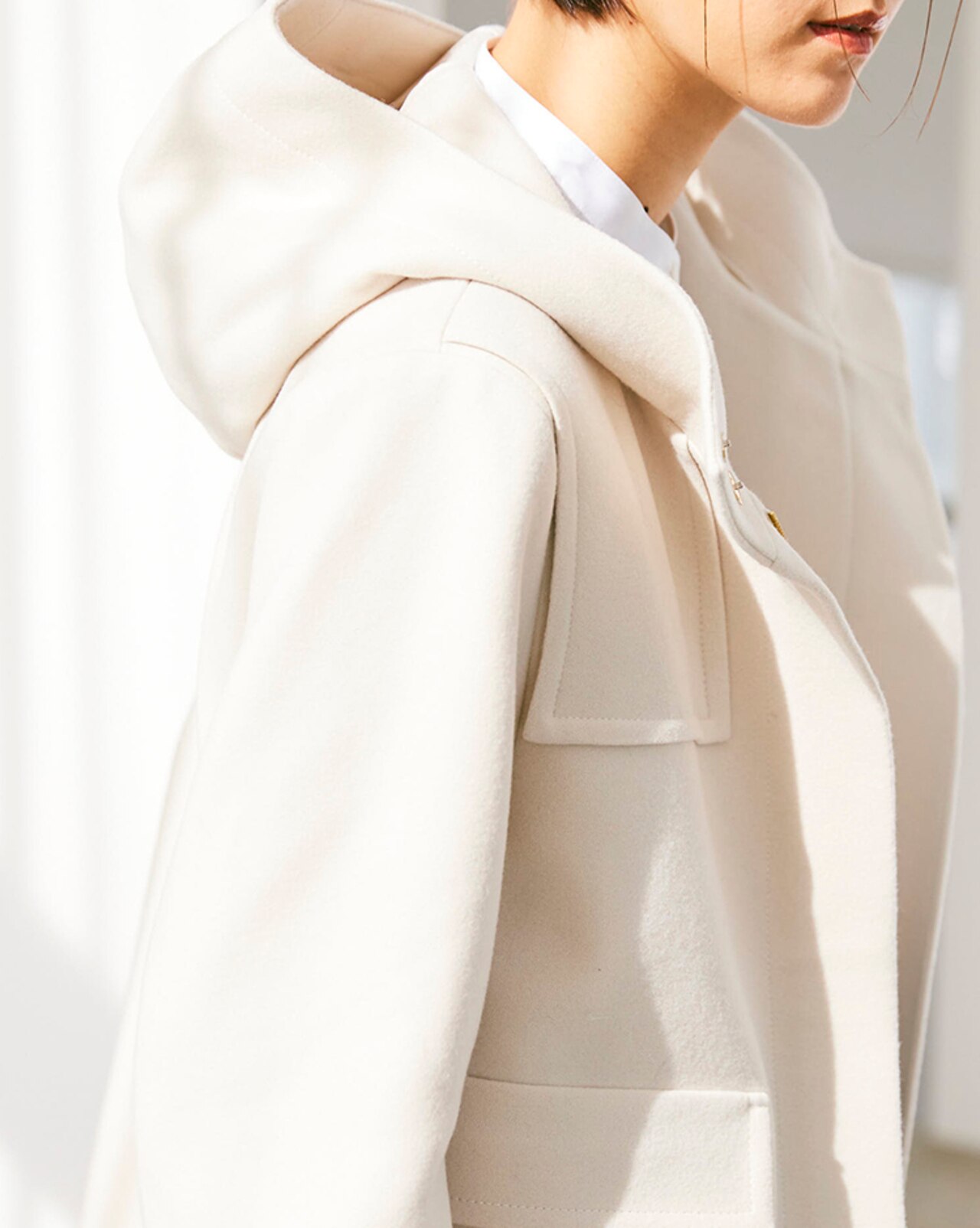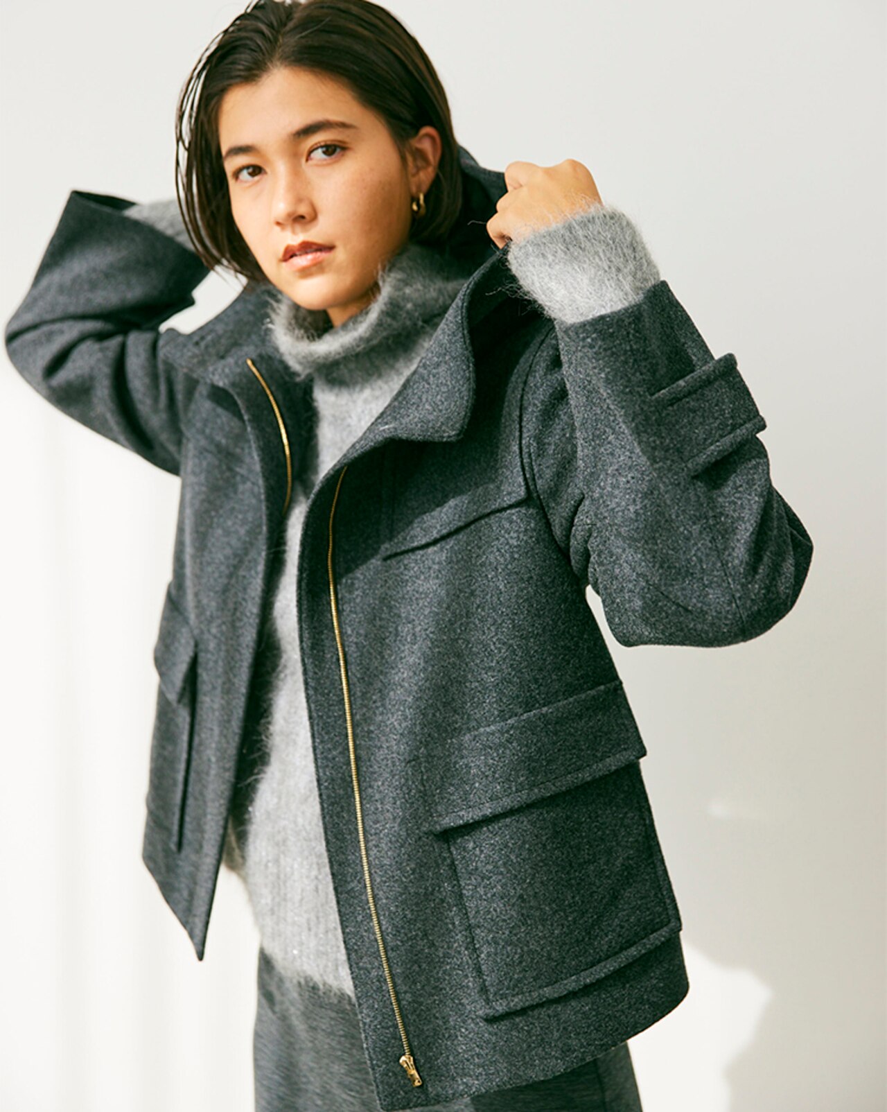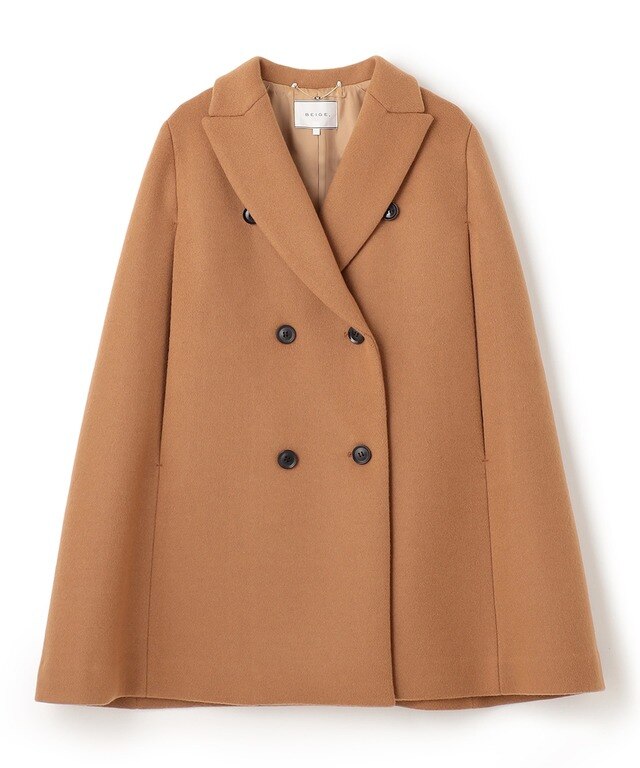 セットインスリーブのようなすっきりとしたケープコート。ヒップが隠れるレングス感で縦長なシルエットがエレガントな雰囲気。上質なウールを使用し、表裏両面に毛羽を整えて光沢感を出したビーバー加工を施すことで、生地の膨らみや素材自体の柔らかさを表現しました。