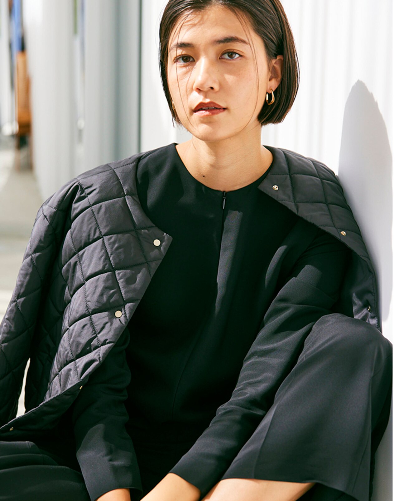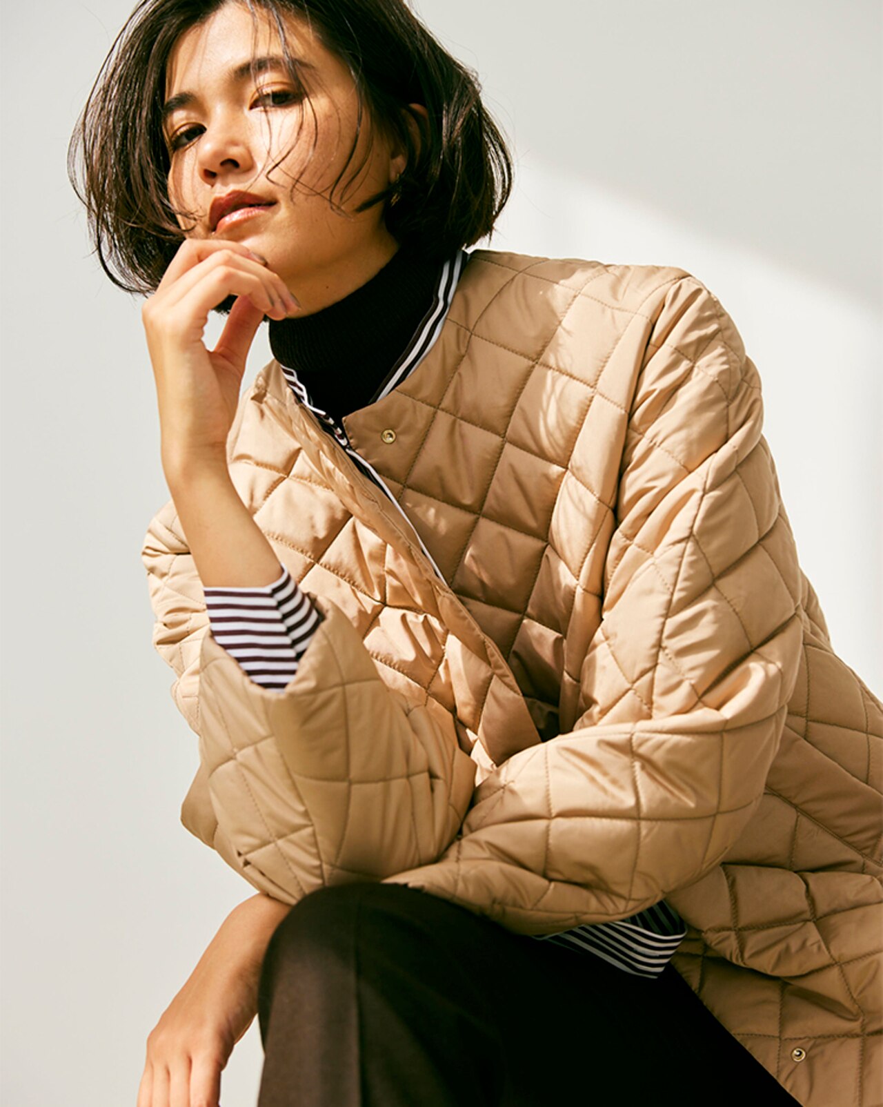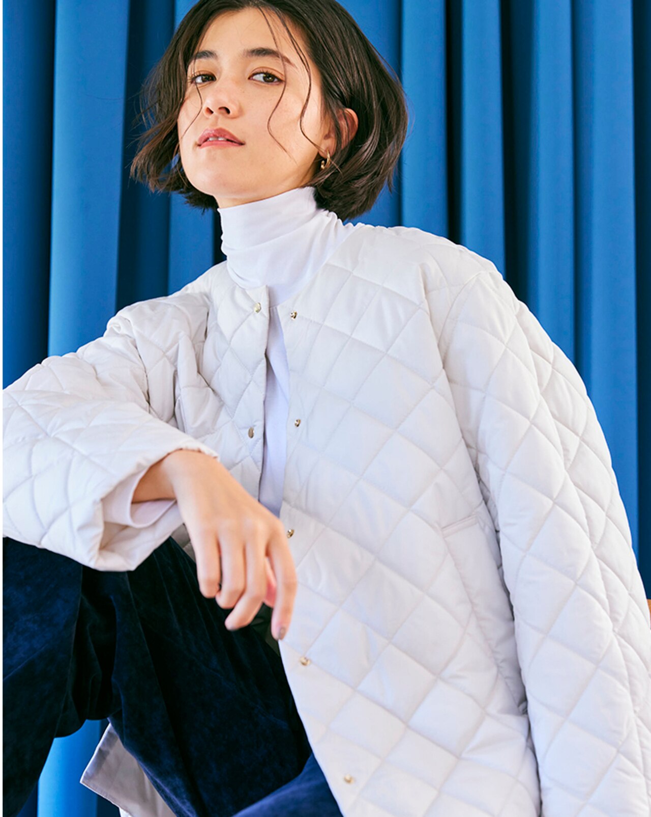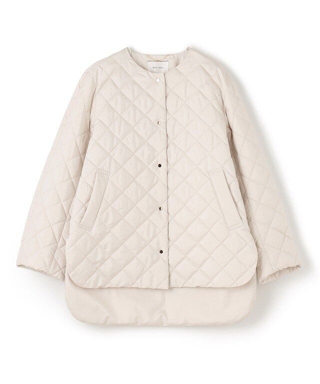 ノーカラーの中綿アウター。フロントのゴールドスナップと前後差のあるレングスが軽やかで華やかな印象に。シルクのような光沢と、陰影と艶やかな表情を持つタフタ素材です。ペットボトルを原料とした再生糸100%の環境に配慮した素材です。通常の中綿より保温性の高い高機能中綿を使用しダイヤ柄のキルトに仕上げました。