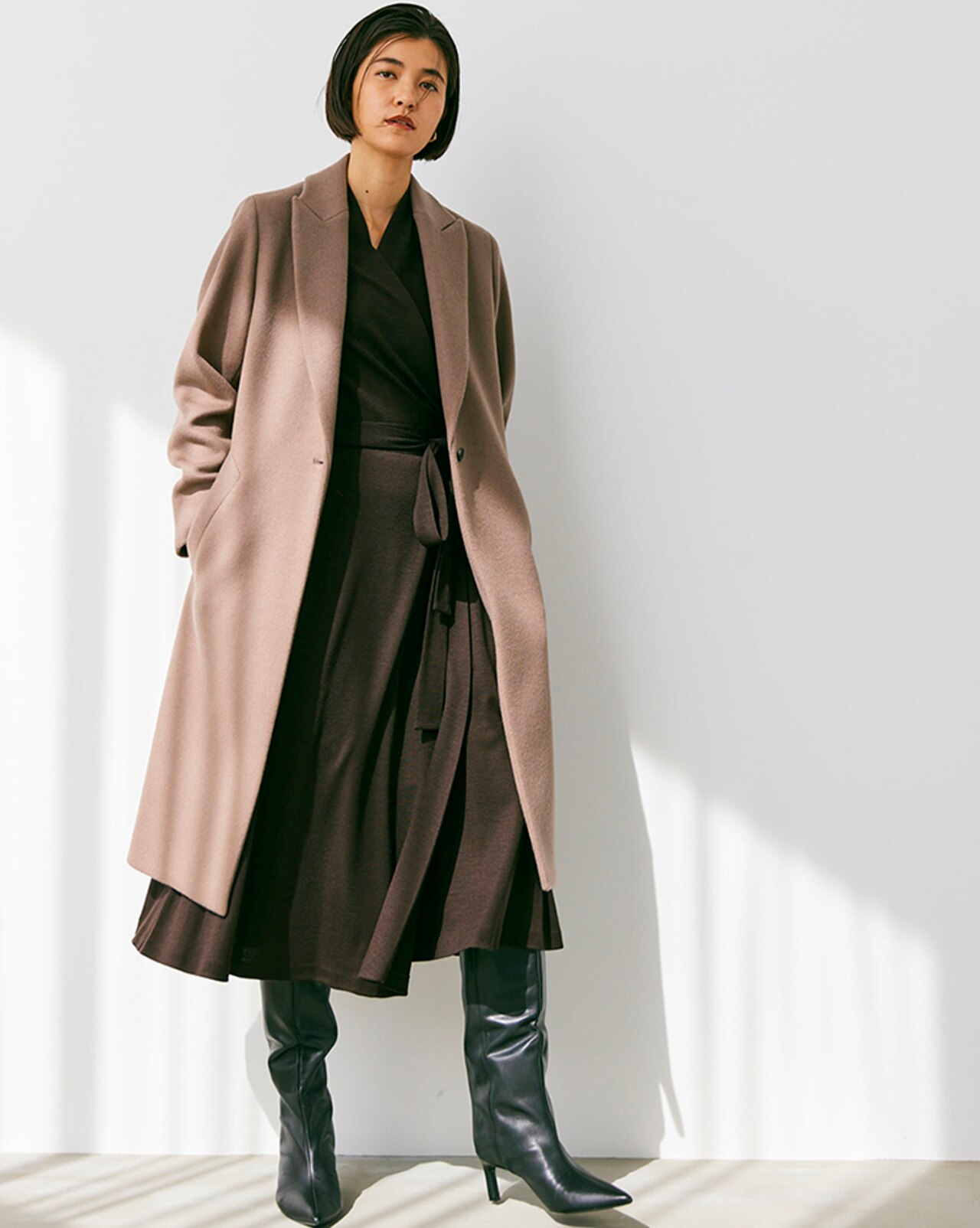 クラシックな印象のロングコート。なめらかな肩のライン、裾に向かって少しフレアのあるシルエットです。きめ細やかで薄く柔らかなリバー素材です。ウールの天然素材ならではの風合いが出ている着心地の良い素材です。