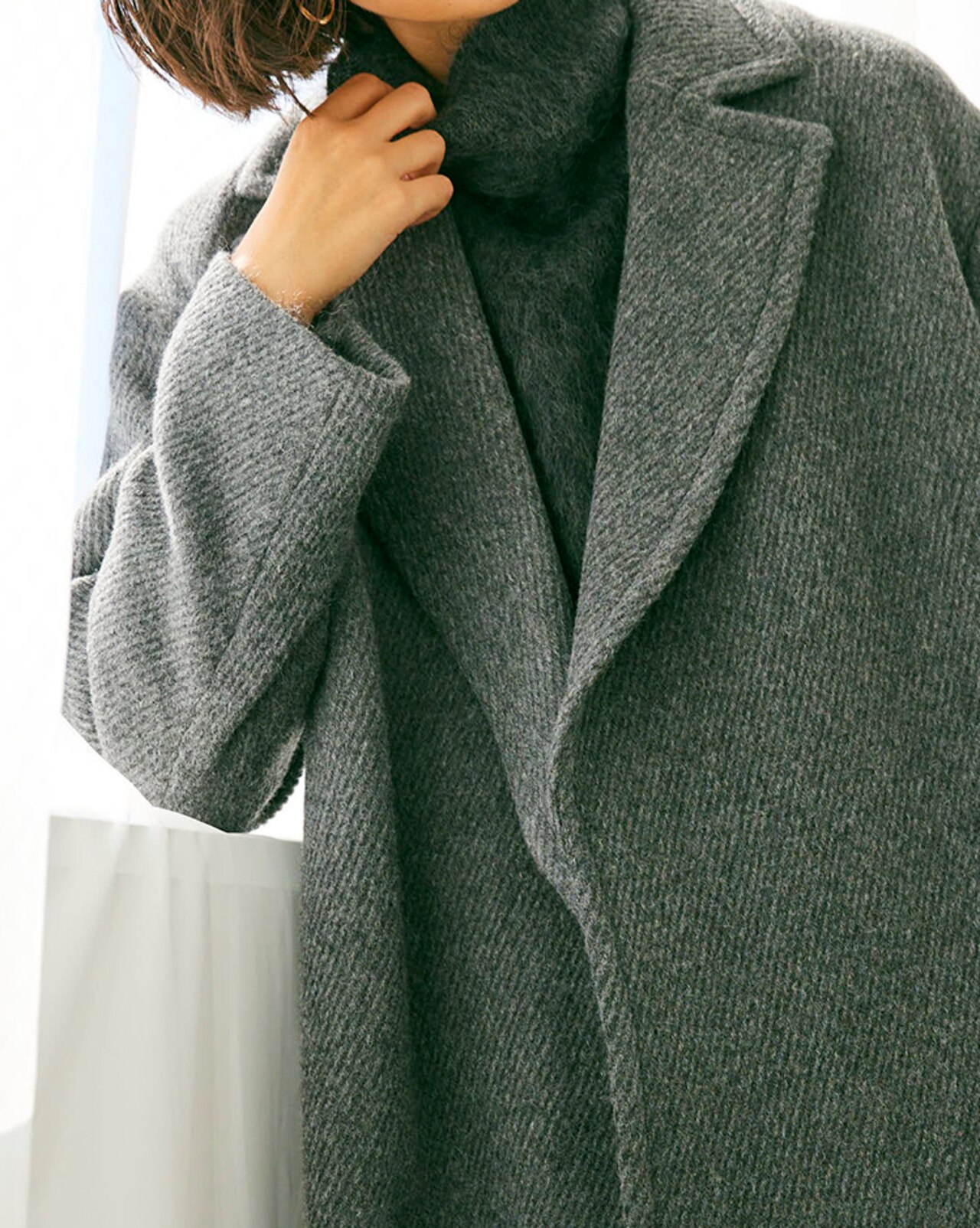 大きな衿が顔周りを華やかに見せるチェスターコートです。身頃や袖にゆとりを持たせ、ガウンのようにサラッと羽織れる上品コートです。ベビーアルパカを使った柔らかくしなやかな素材で、ペルー原産のベビーアルパカとウールと交織することで適度なハリ感を出しました。