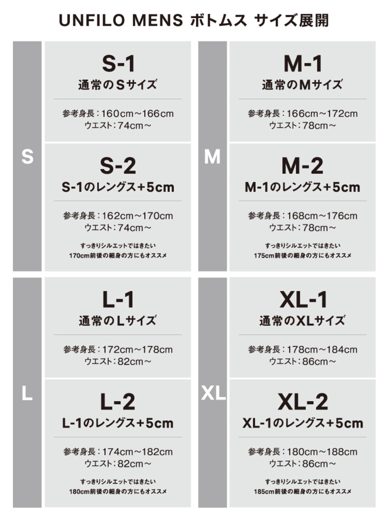 ボトムスはS・M・L・XLそれぞれのサイズに丈の長さが2タイプずつ設けているので、ジャストフィットな丈をお選びいただけます。
