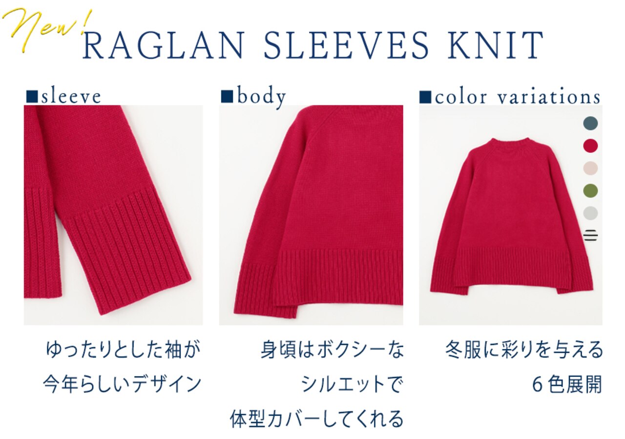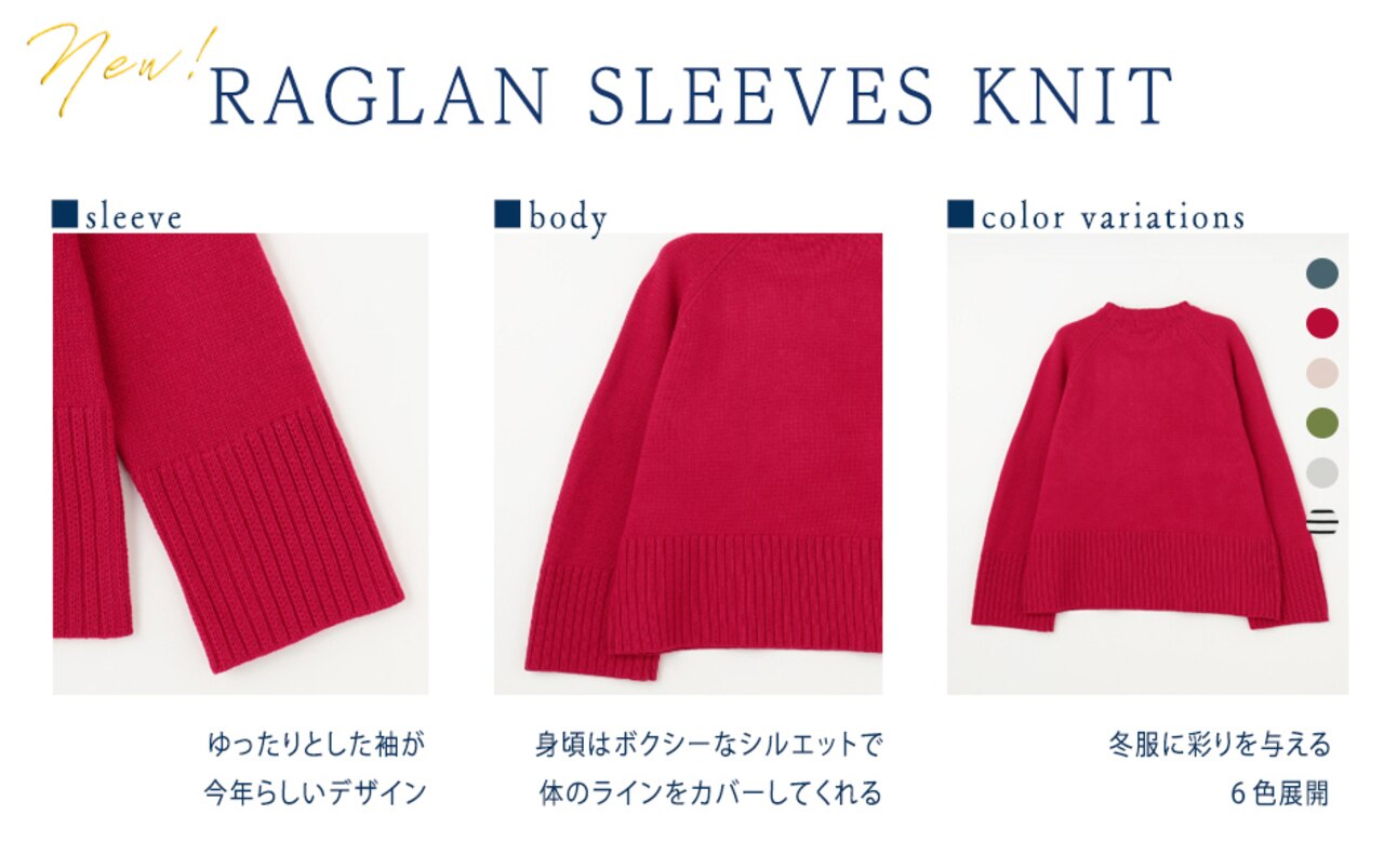 昨年大好評のハイネックに加えて、今年はラグランスリーブが初登場!