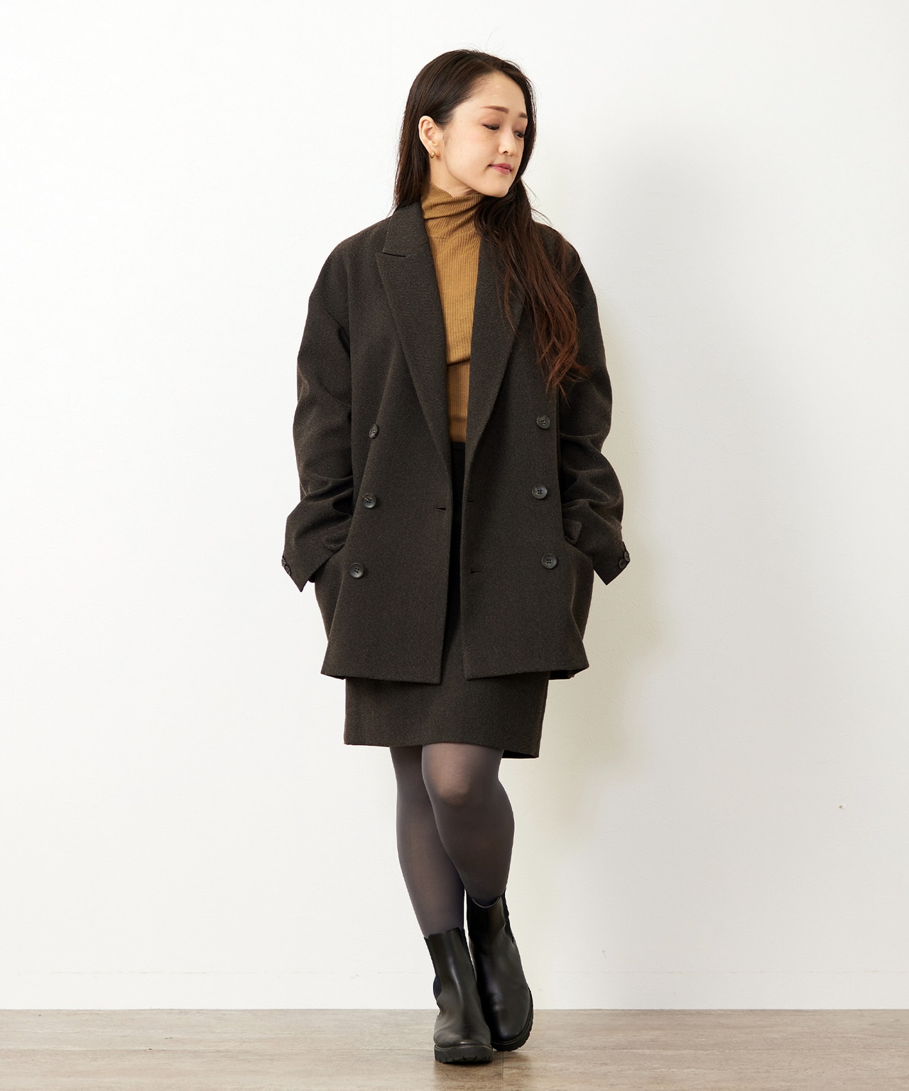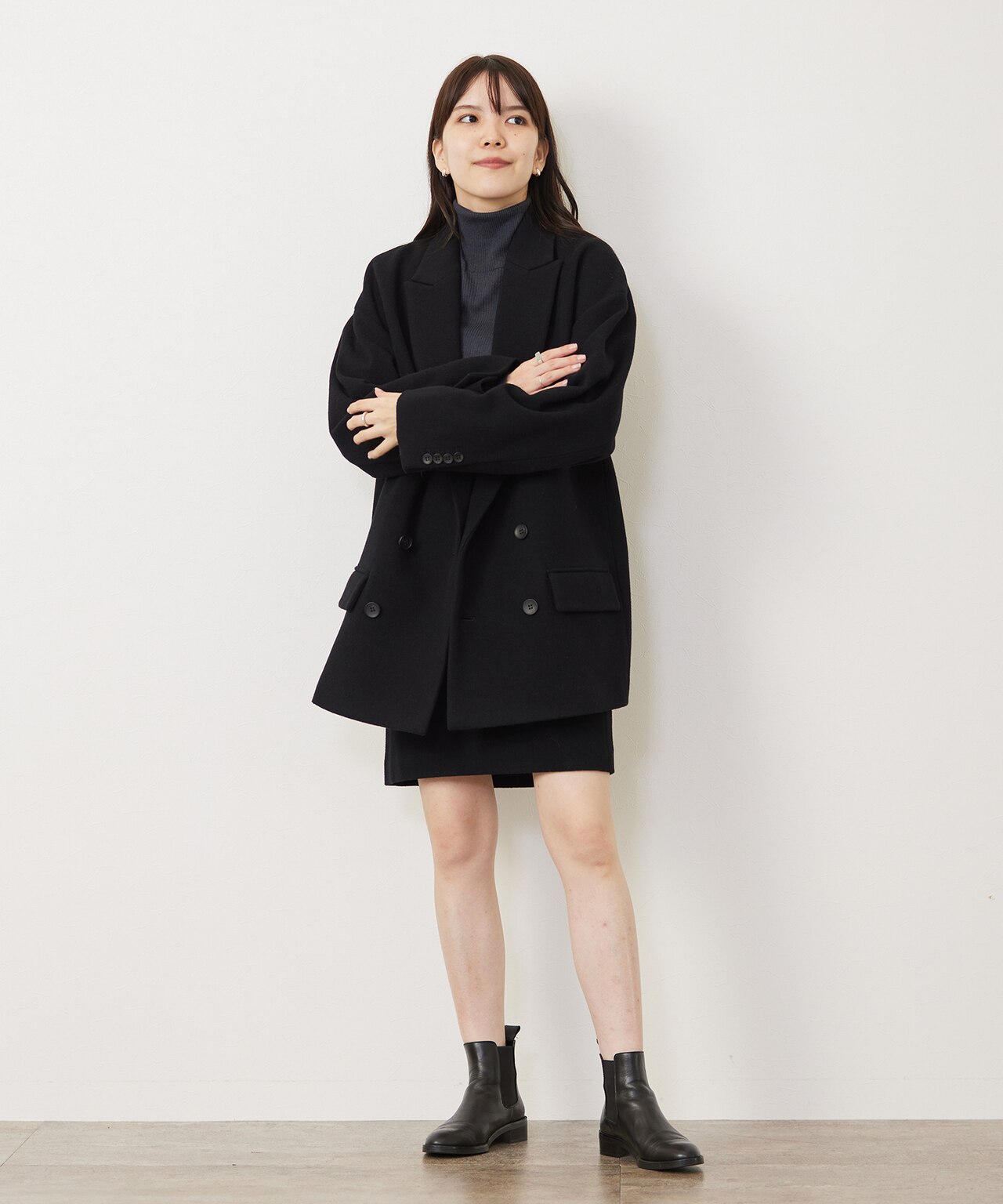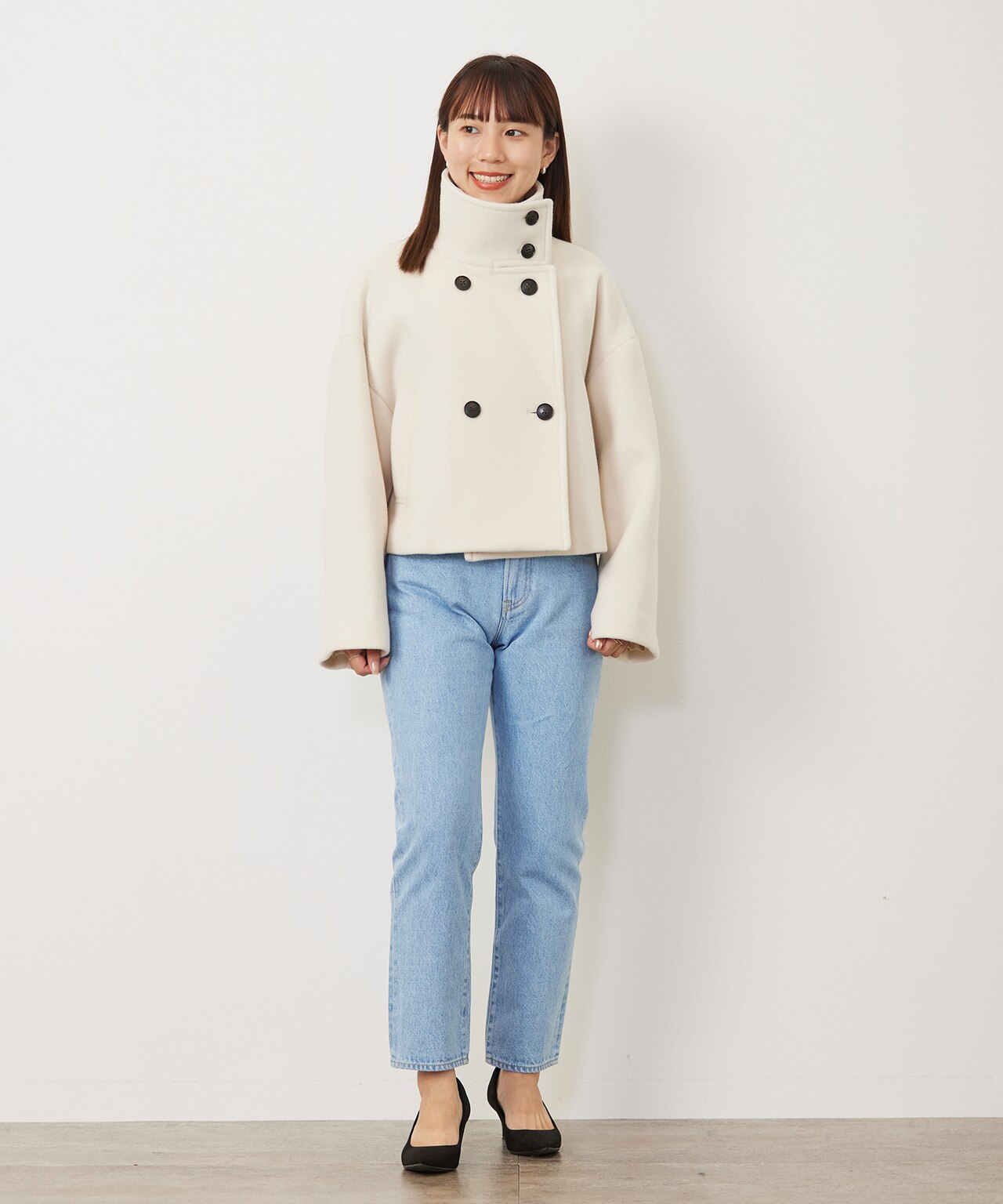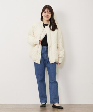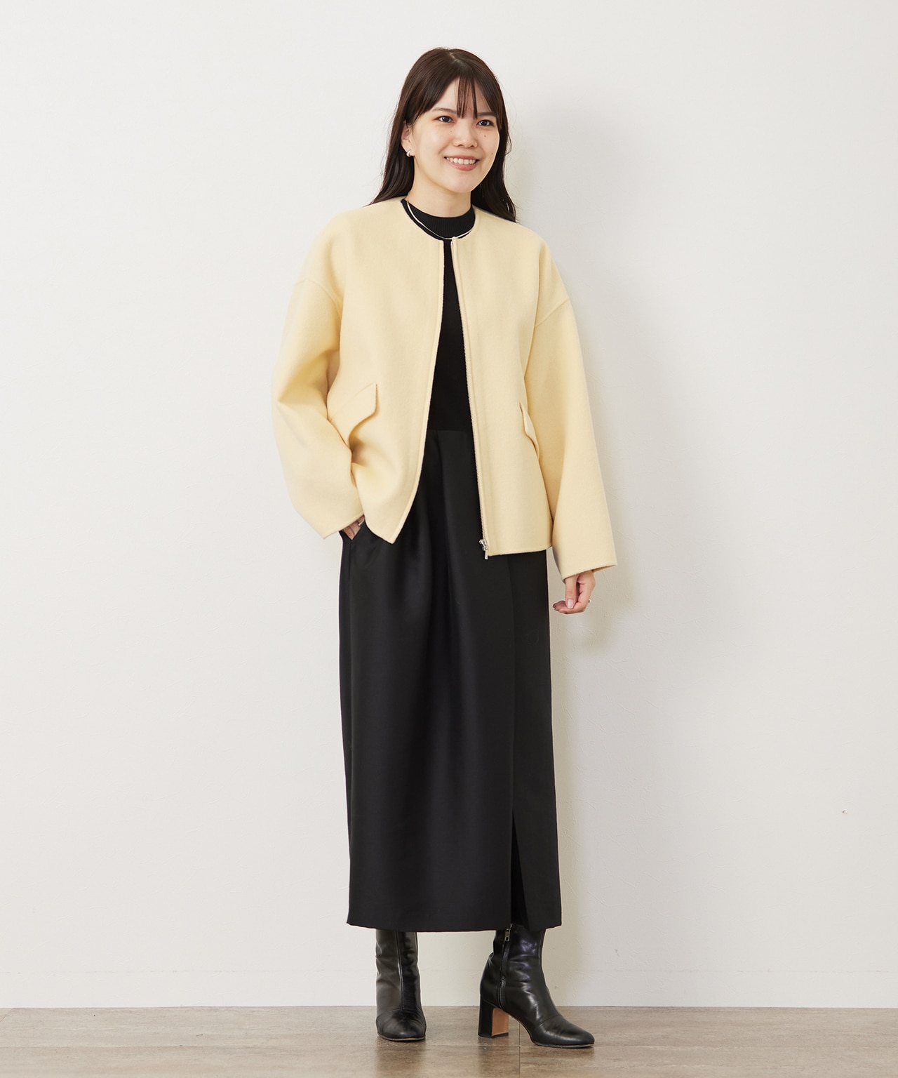 150cm代でサイズ2を選ぶなら、ボトムスはすっきりシルエットで合わせるのがおすすめ。(STAFF身長:158cm)
