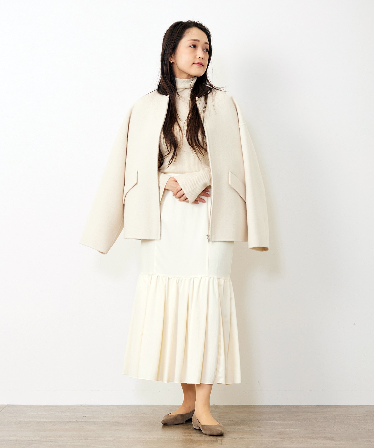 たっぷりとした身頃感なので、丈は程よく軽さのあるデザイン。よりたっぷりとゴージャスに着たい方は、サイズ2がおすすめ。(STAFF身長:162cm)