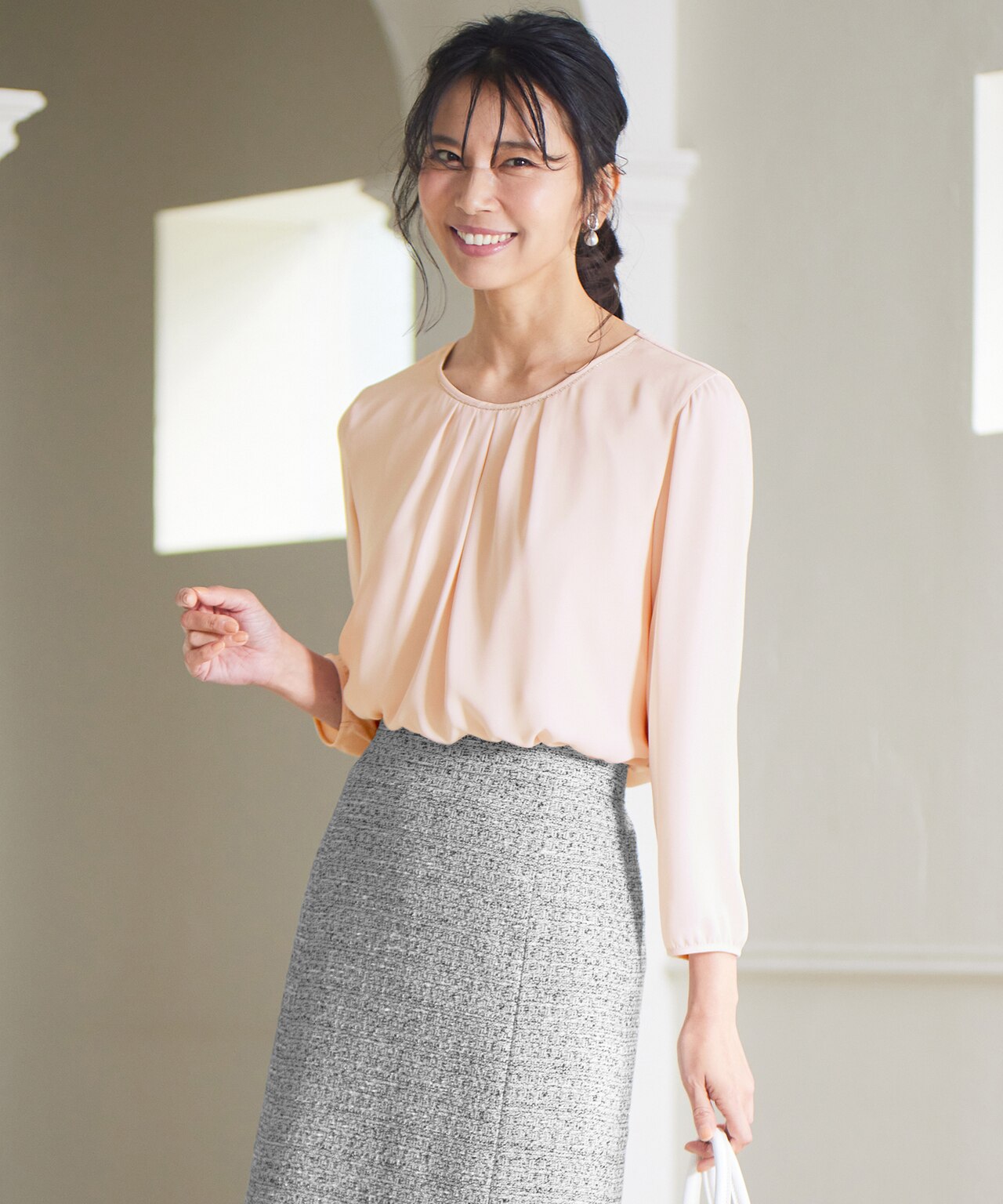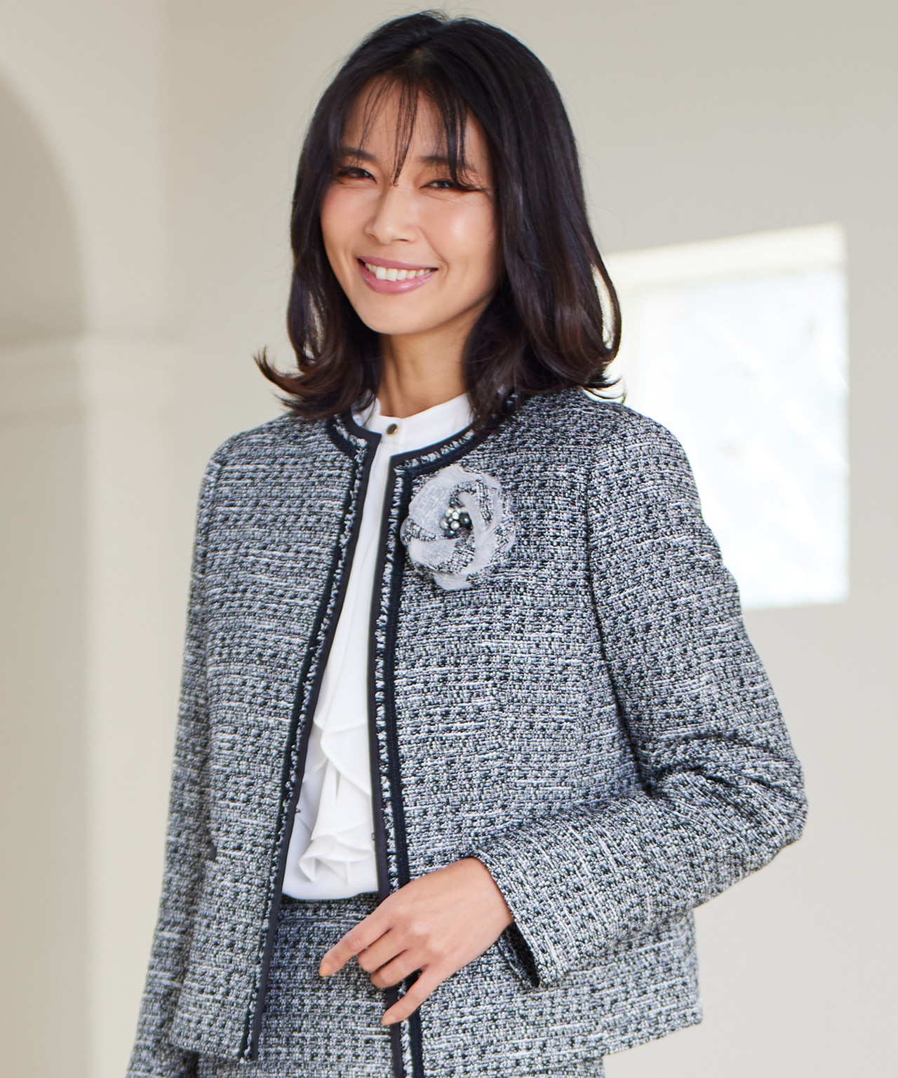 23区で定評のある素材、なかでも今シーズンさらに着心地よくなったツイード素材のジャケットをあわせたスカートスタイルなら、ハレの日に相応しい、王道セレモニースタイルが完成。コサージュやパールアクセで品よく華やかさをプラスして。
