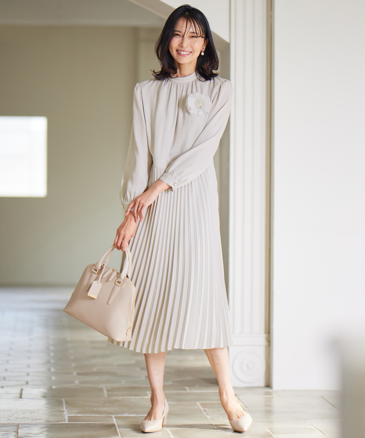 品よく程よいデザインで身体のラインを美しく見せてくれるワンピーススタイル。1枚でもジャケットとも相性よく、華やかさと洗練された空気感を漂わせてくれる頼れる1枚。
