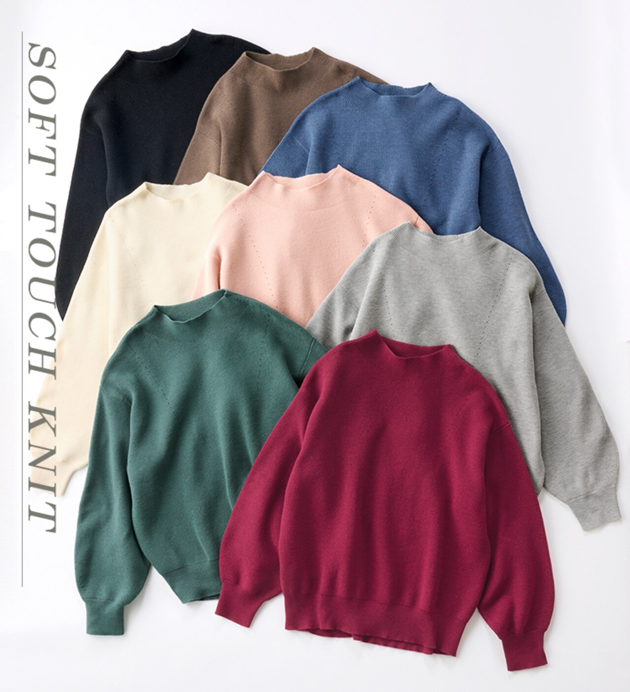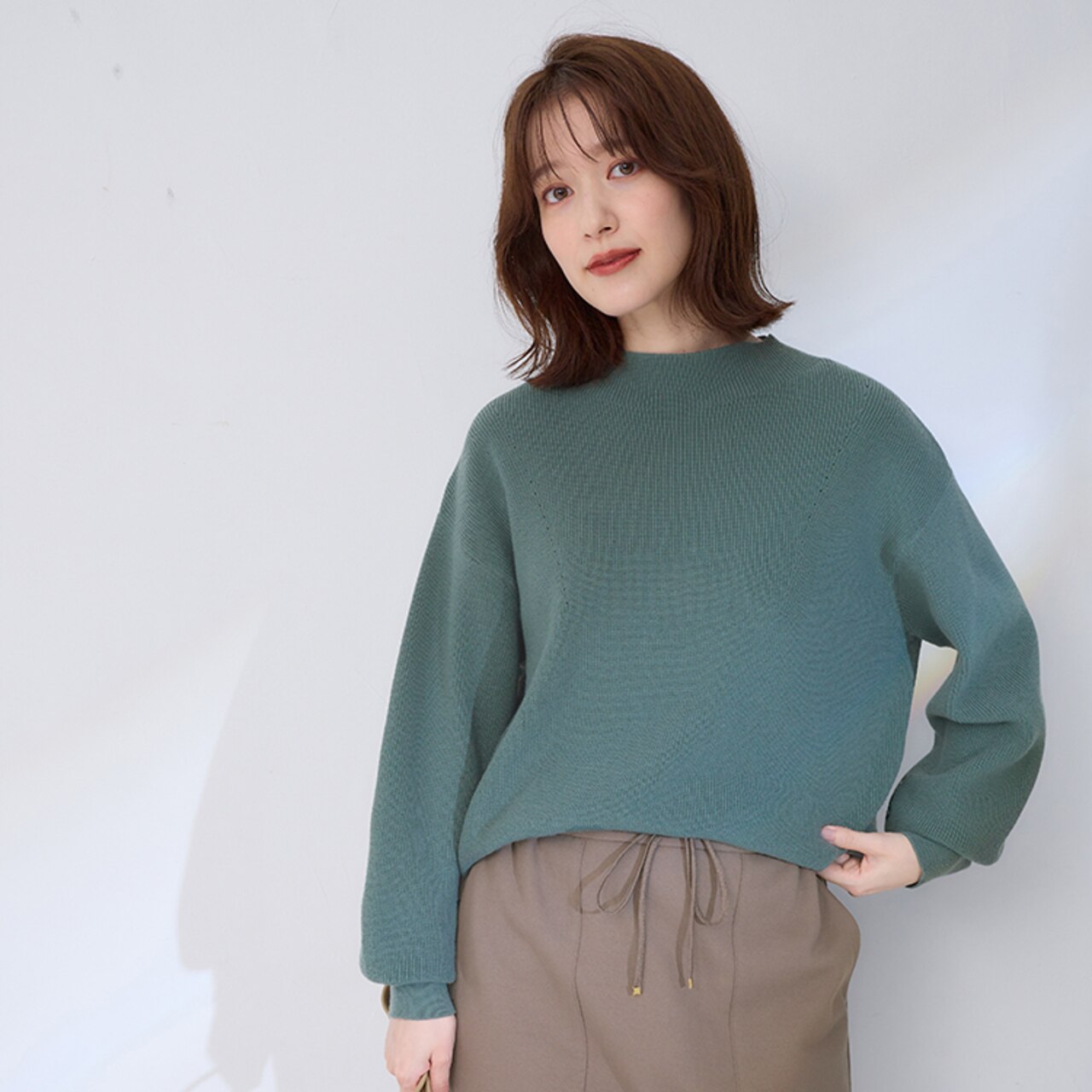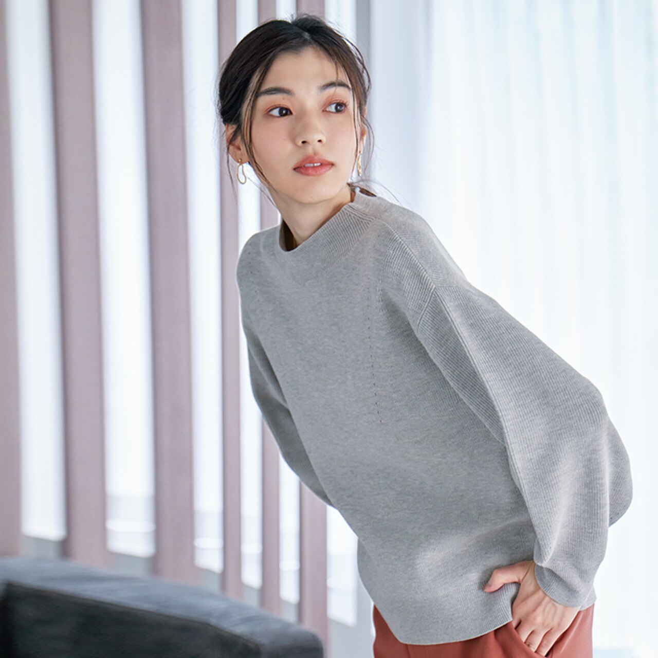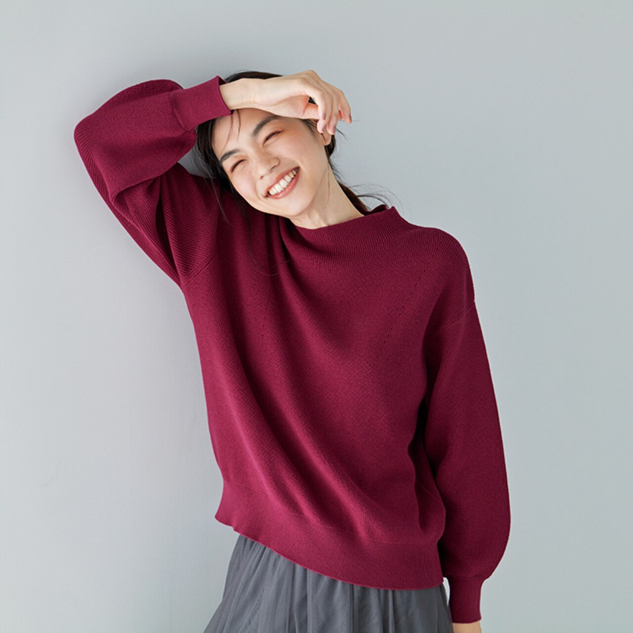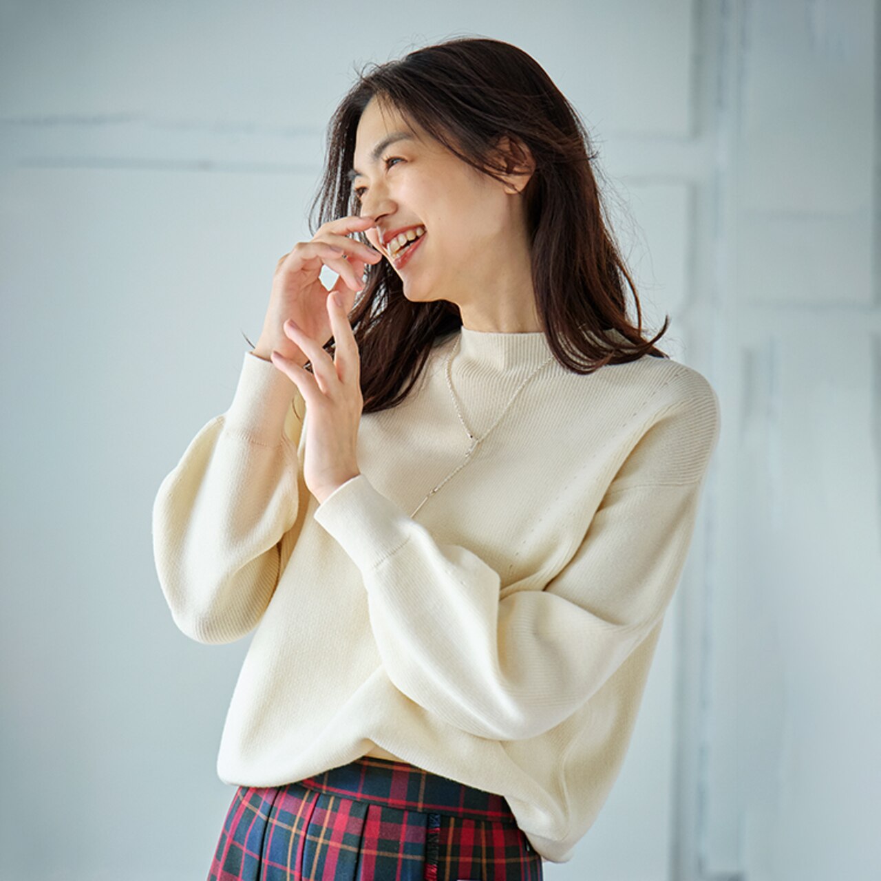 ソフトタッチニットはボトムスにインしてももたつかず、綺麗なシルエットに。いつもより少し派手なボトムスと合わせて、ホリデーの特別感を味わって。