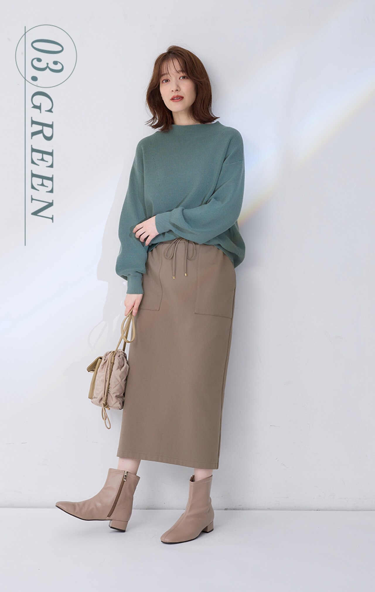 グリーンのニットはブラウン系で合わせて主役ニットを際立たせる