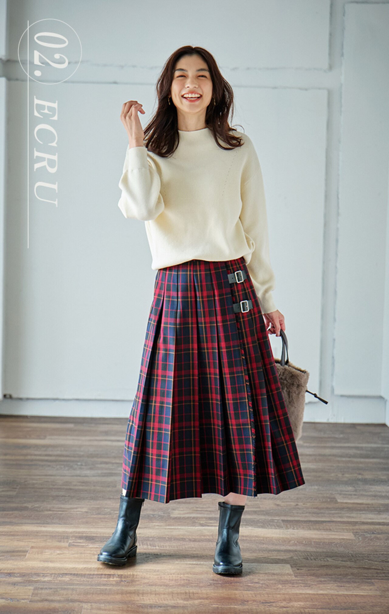 定番白ニットには赤チェックで合わせてクリスマスムードを高める