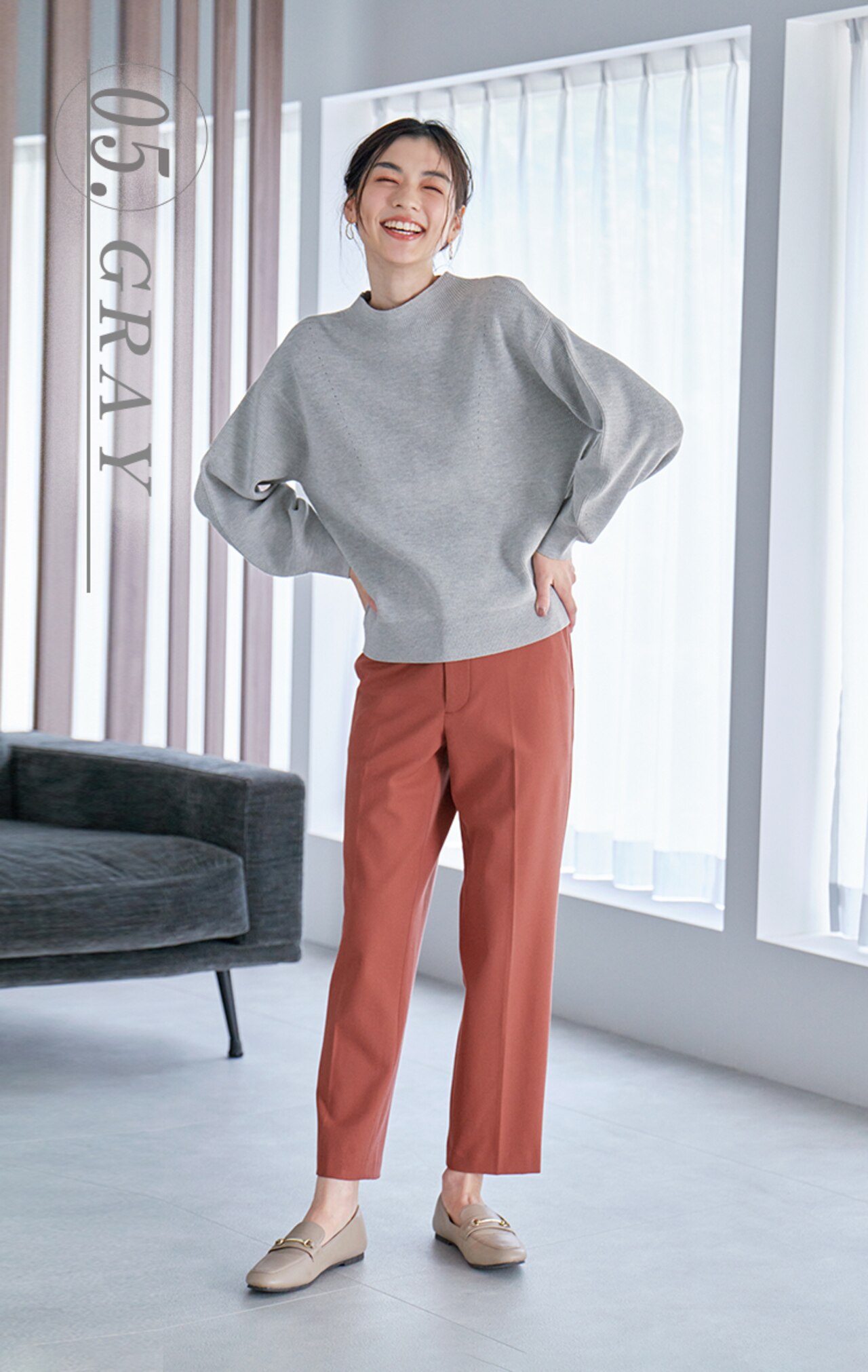 どんなボトムスとも相性抜群なグレーニット。せっかくだから、カラーパンツに合わせて気分の上がる鮮やかなスタイリングにも挑戦してみて。派手すぎないくすみカラーのパンツなので、コーデに馴染みやすく知的な印象に。