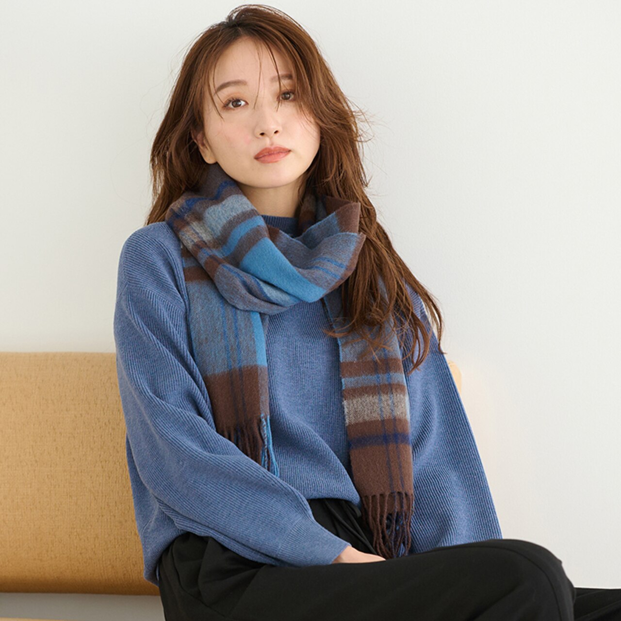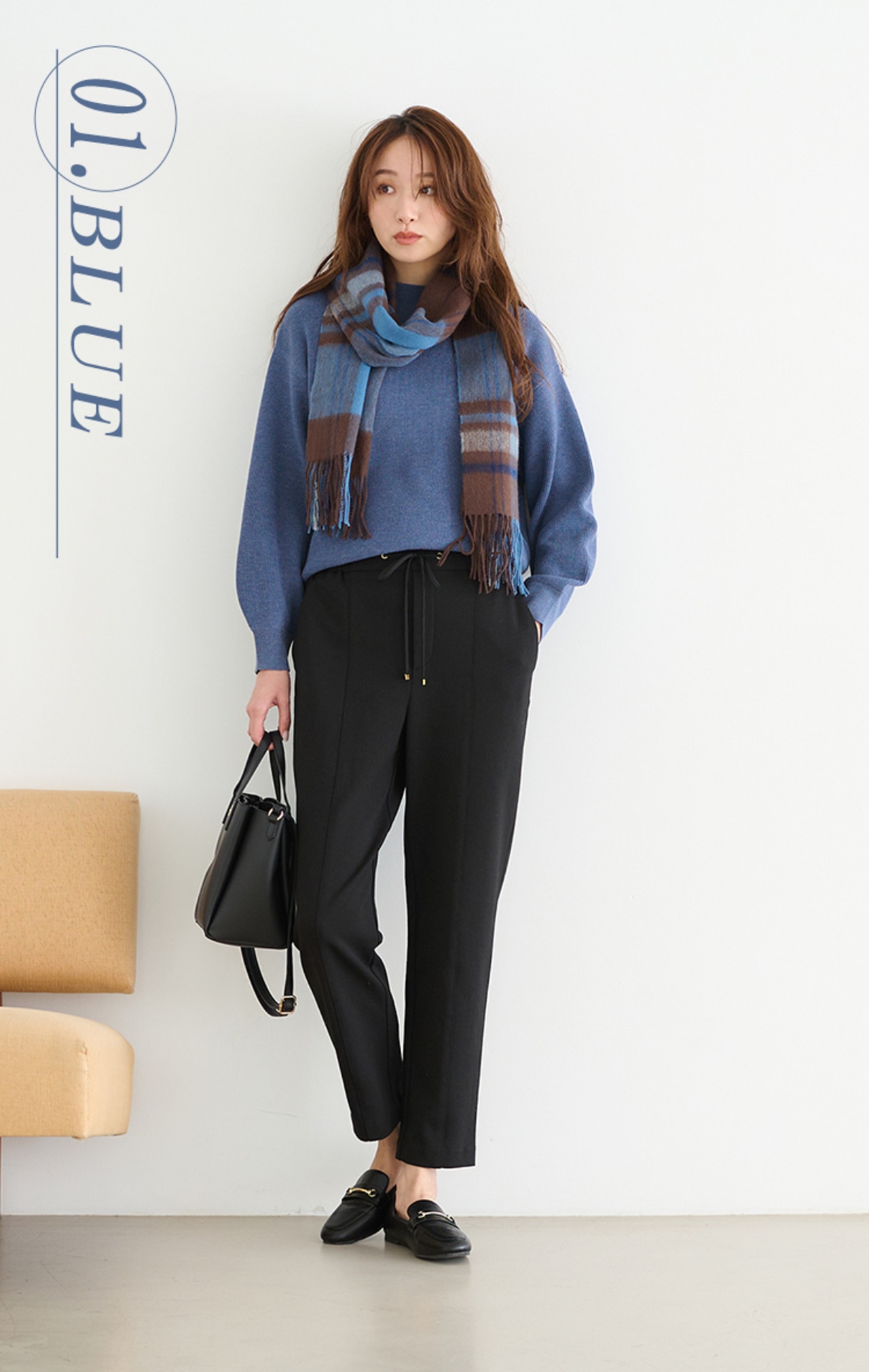 あえて同系色のマフラーを合わせる際は、濃淡を意識するのがポイント。ブルーが映えるよう、パンツや小物は黒で揃えると締まりのあるスタイリングに。