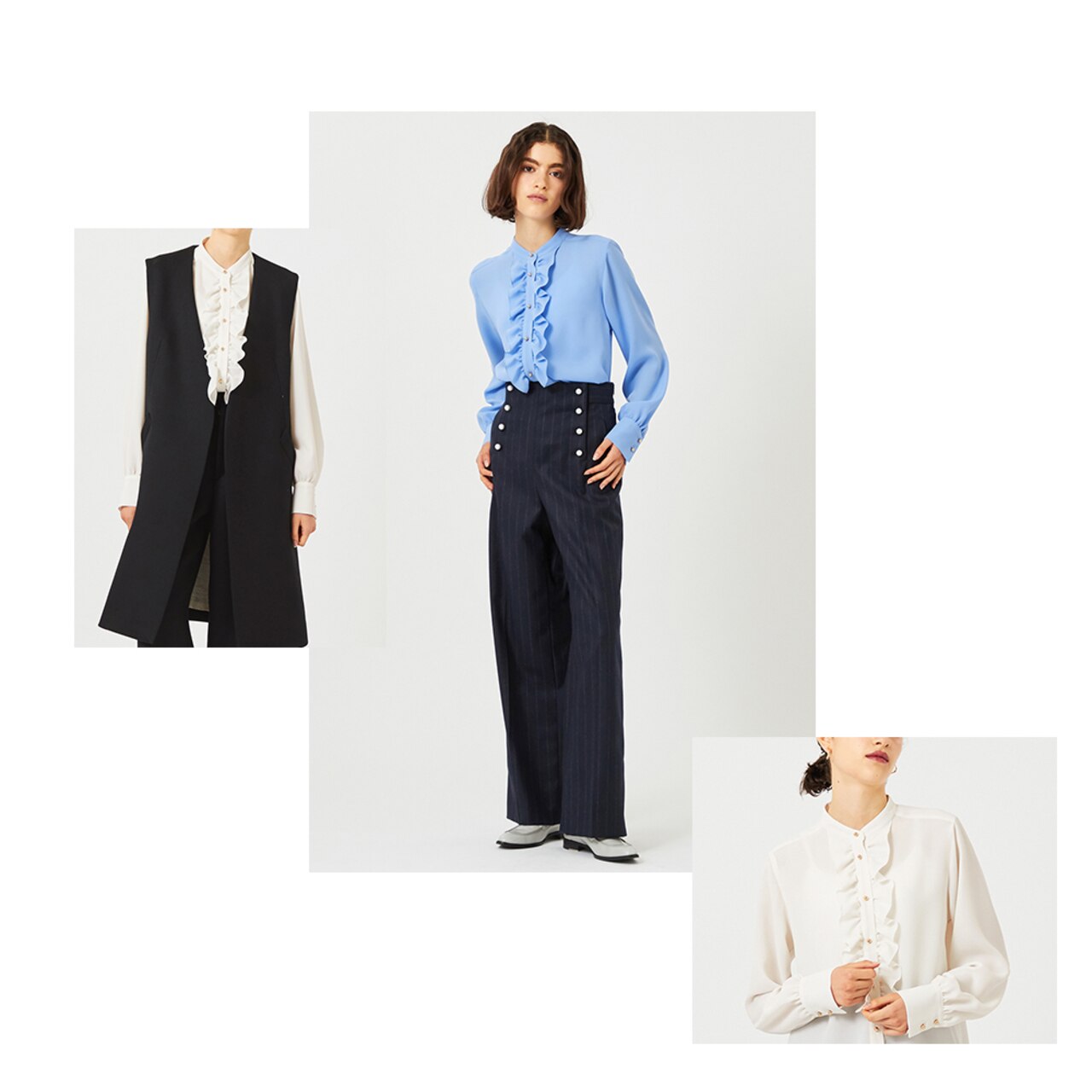 アクセサリー無しでも、ぱっと華やぐフリルブラウス。フォーマルからカジュアルまで幅広い着こなしが楽しめます。ジレやマニッシュなボトムに合わせれば、程良い甘さが引き立つコーディネイトが完成です。