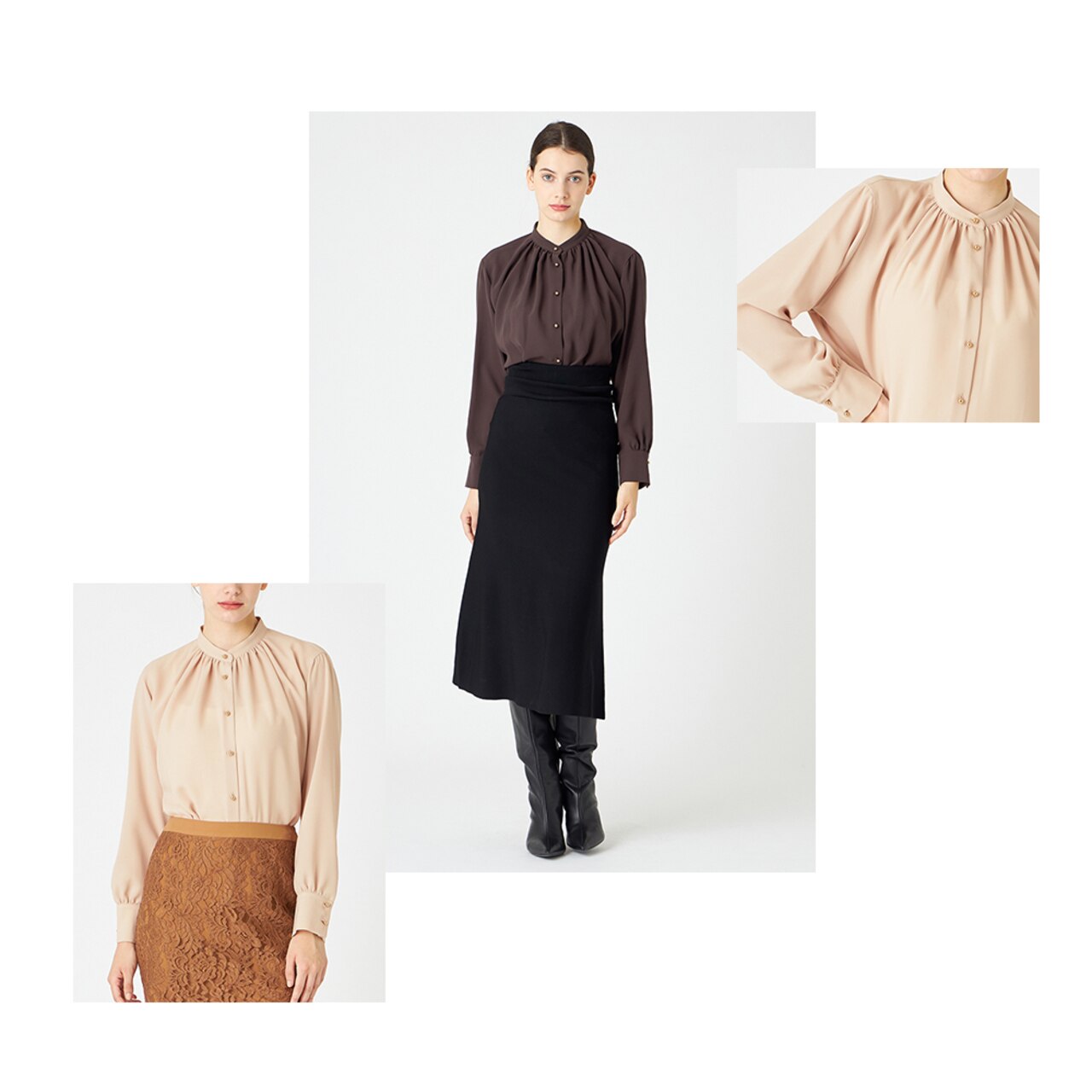 小さなゴールド釦とギャザーがポイントのブラウス。シンプルだからこそ、通勤や休日コーデにも使いやすく、タートルなどインナーに重ねてシーズンも長くお召いただけます。タイトなボトムを合わせることで、メリハリのあるバランスの良いスタイリングに。