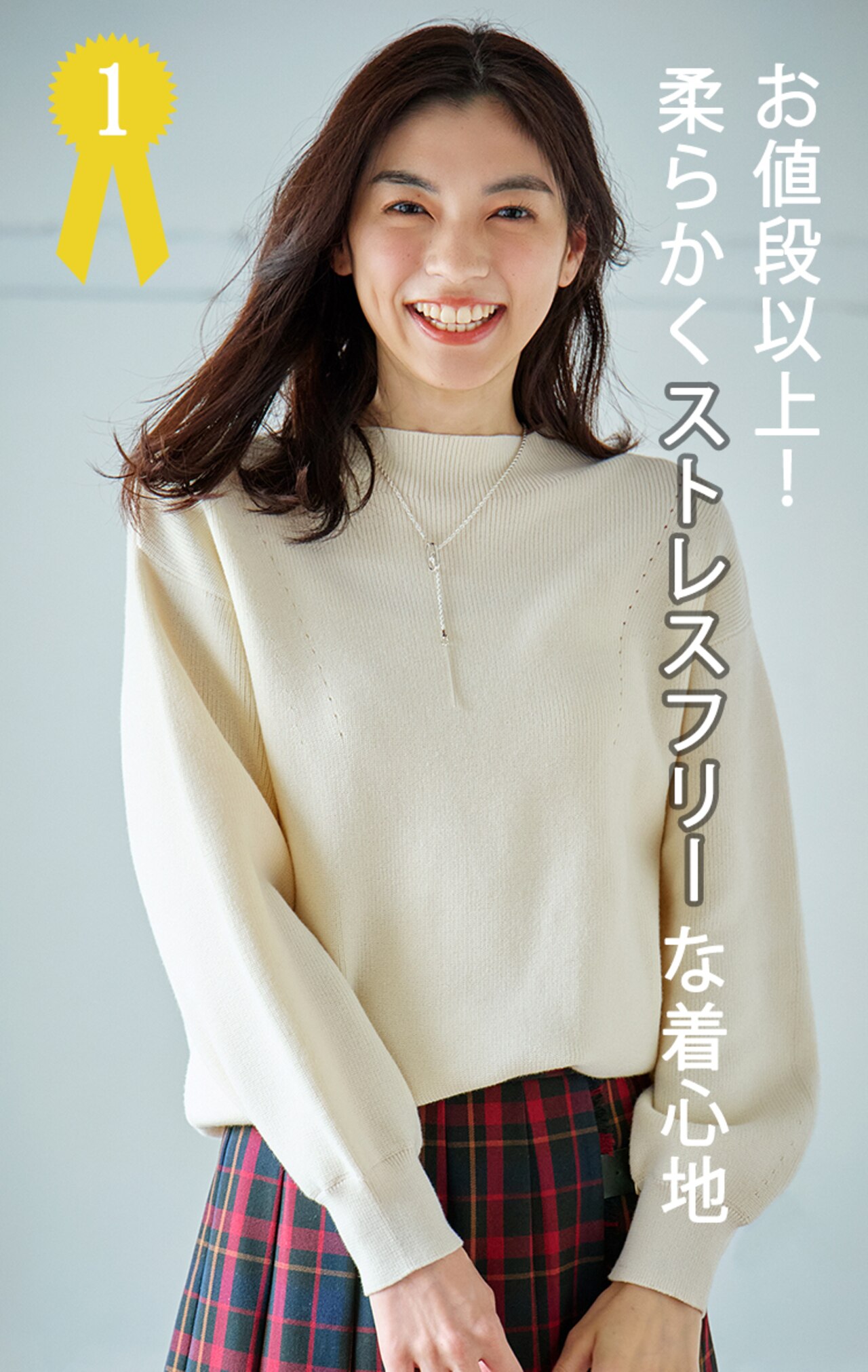 お求めやすい価格も魅力のソフトタッチポリエステルニット。柔らかな素材なので首回りもチクチクせず、ストレスフリーな着心地。後裾にテールを付ける事で、スカートにもパンツにも合わせやすい。