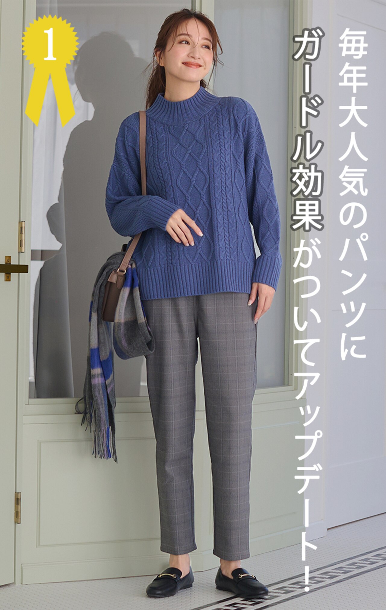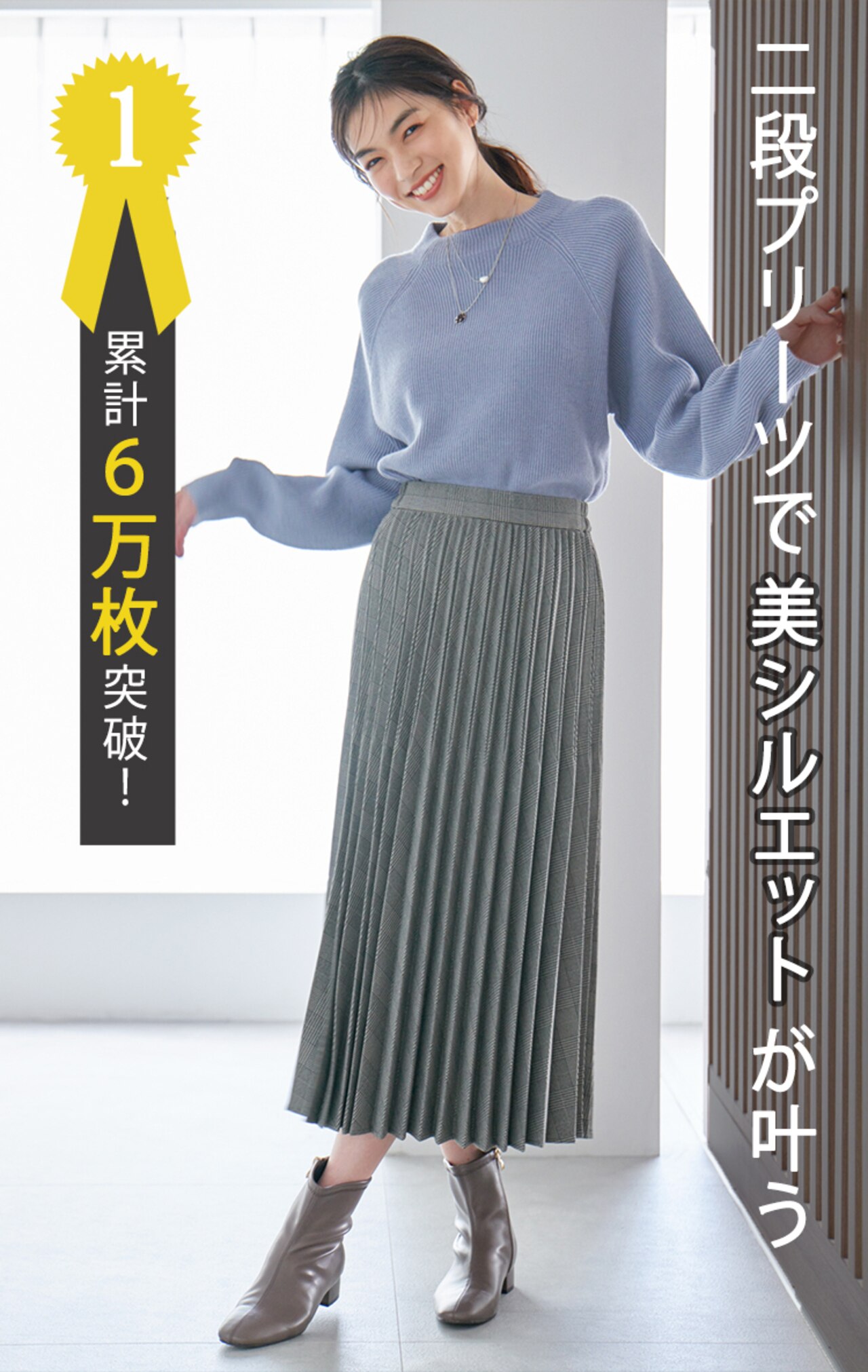 2段にわけてプリーツをかけることで、お腹まわりやヒップまわりをさりげなくカバーしてくれる美しいシルエットに。ウールのような柔らかく上品な素材なのに、ポリエステルの糸を使用しているためシワになりにくいのが魅力。