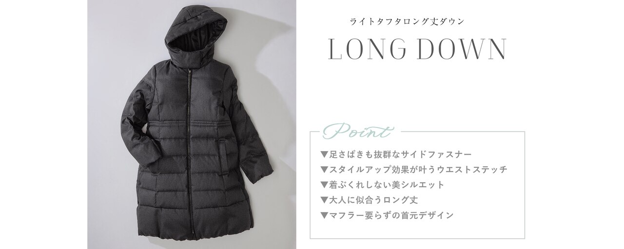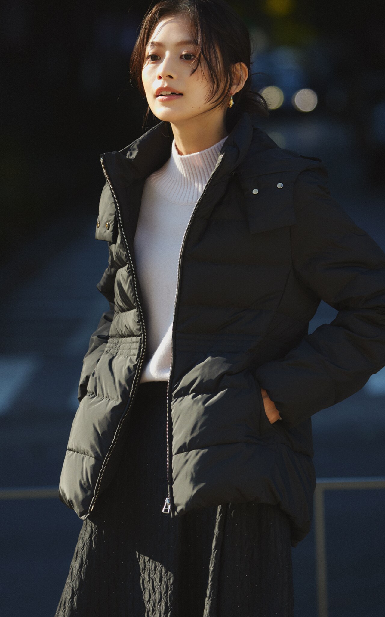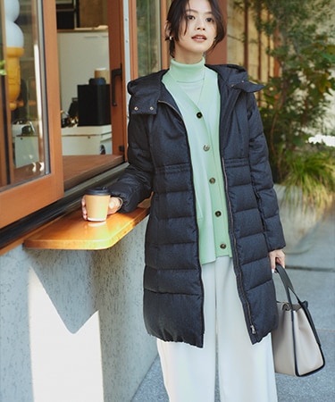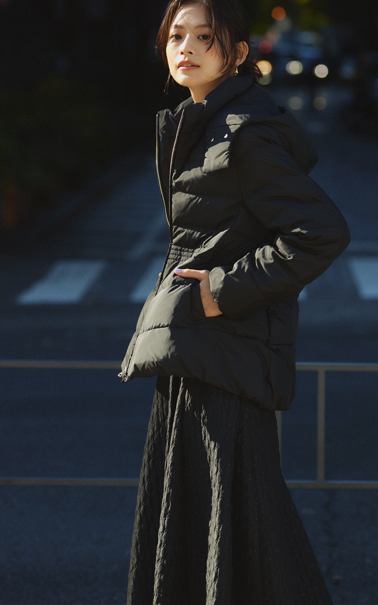ウエストがシェイプされたデザインのロングダウンは着ぶくれせずすっきりとした印象に。裾はファスナーでシルエットを変えることができるので、どんなボトムとも相性抜群です!