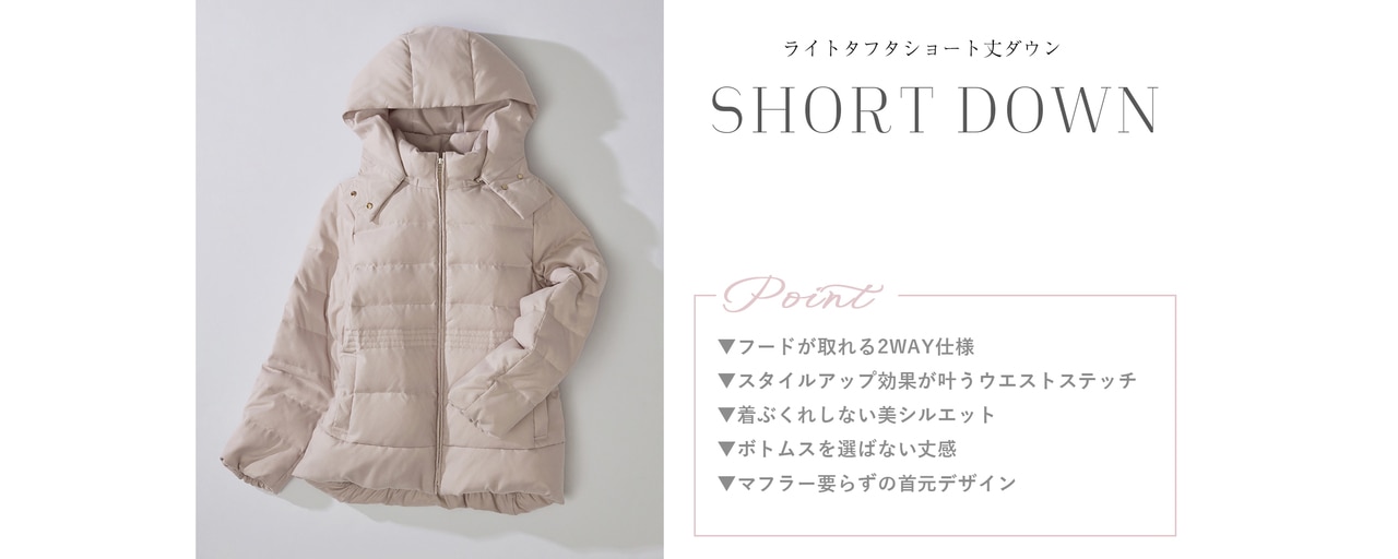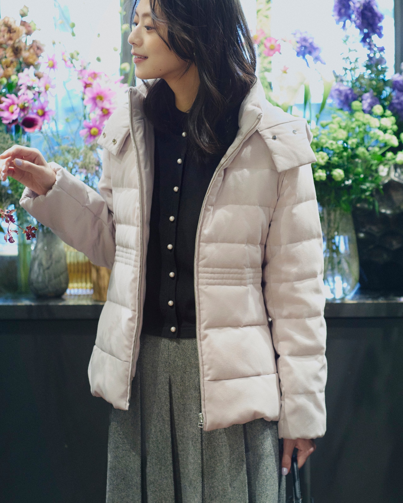 着ぶくれしない美シルエットのショートダウン。程よくゆとりがあり、見頃のデザインステッチがウエストをスッキリ見せてくれます!お尻までかかる丈感で防寒性もバッチリです◎