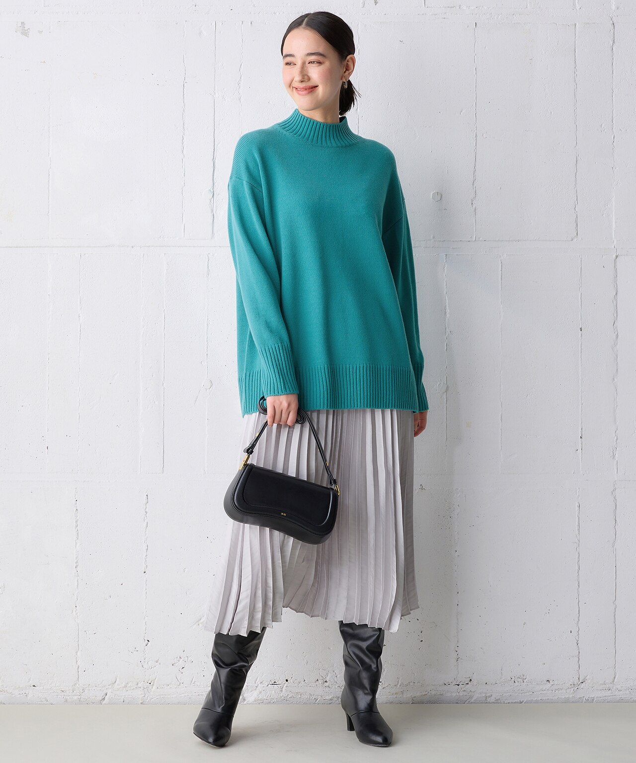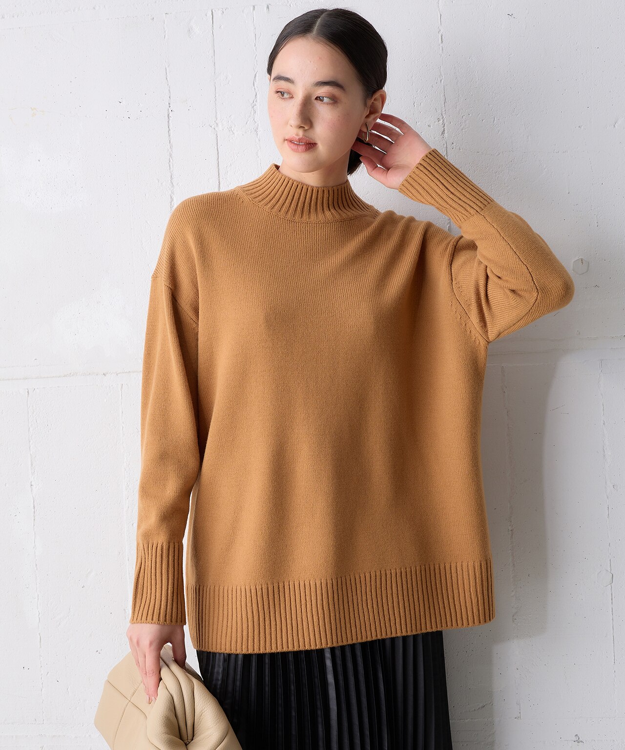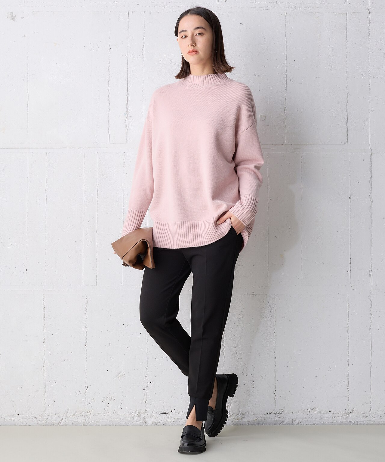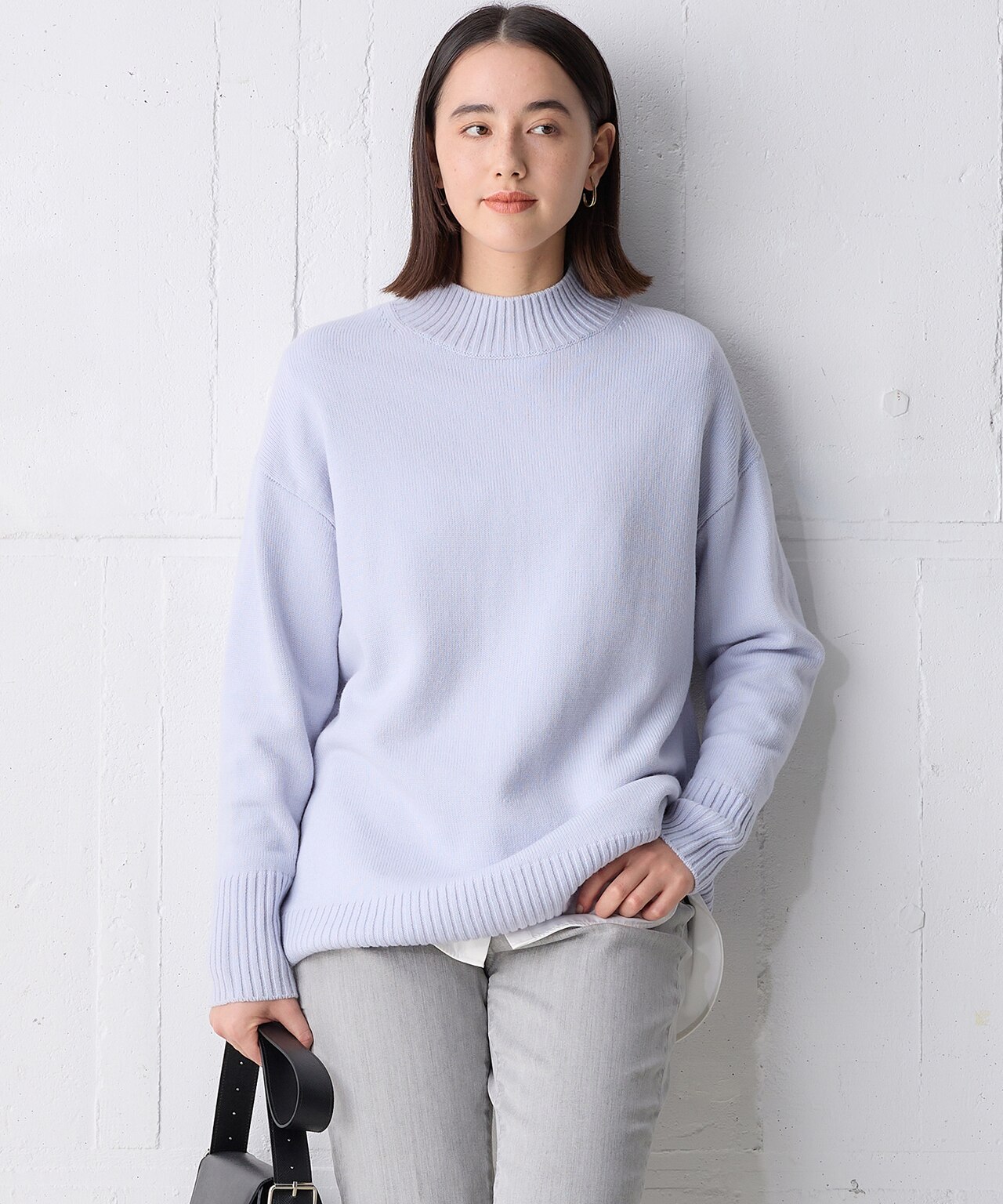 ミドルゲージでボリュームが出過ぎない、程よいワイドシルエットのモックネックのプルオーバー。
