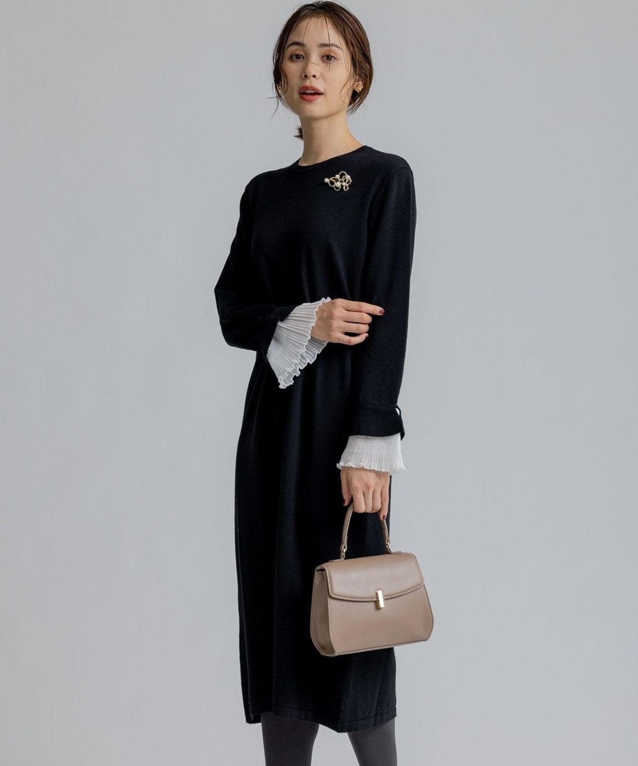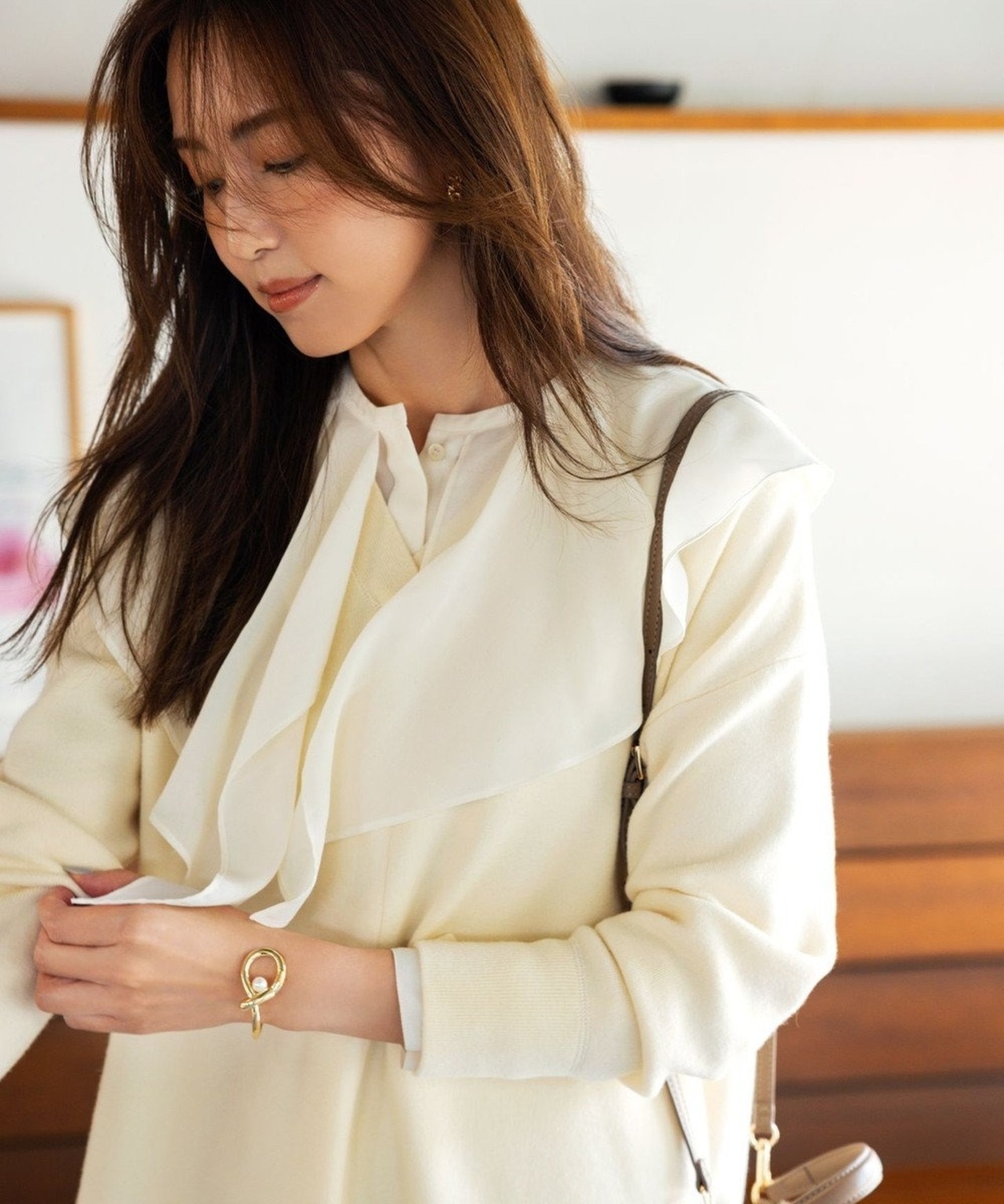 ☑ シフォンカフスとバックのビジュー釦がフェミニンな雰囲気に