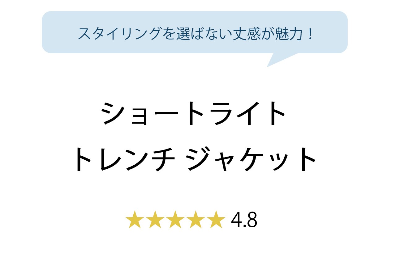 ショート丈のトレントコートは少ない中、希望のコートにであえました。シンプルでカジュアルにもきれいめにも合わせやすいと思います。