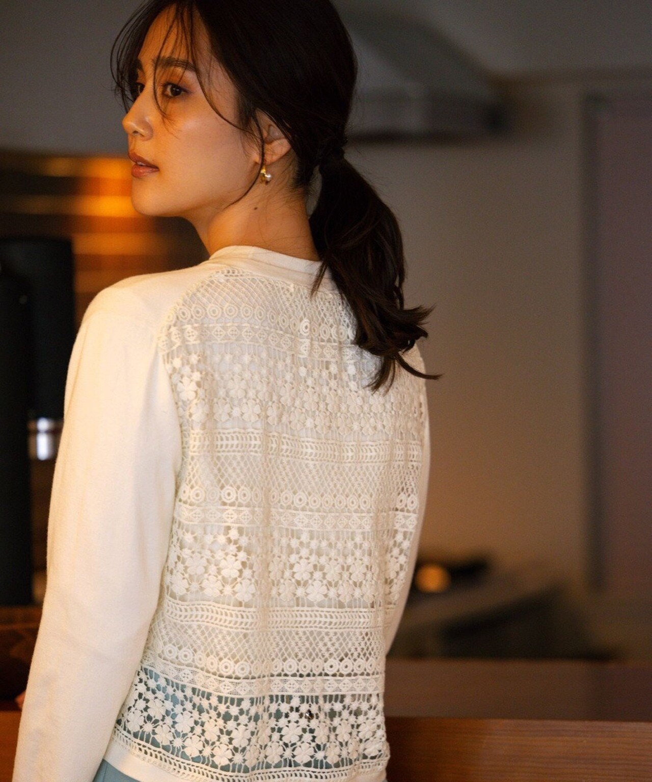 色がすごくキレイで、デザインのレースもかわいいです。程よい生地の厚さとバックはレースになっているので、カーディガンは春先まで着れそうです。セーターは腕の所にパールボタンが付いていて、前上がりの後ろ下がりのデザインになっているので1枚でもかわいく着用できます。